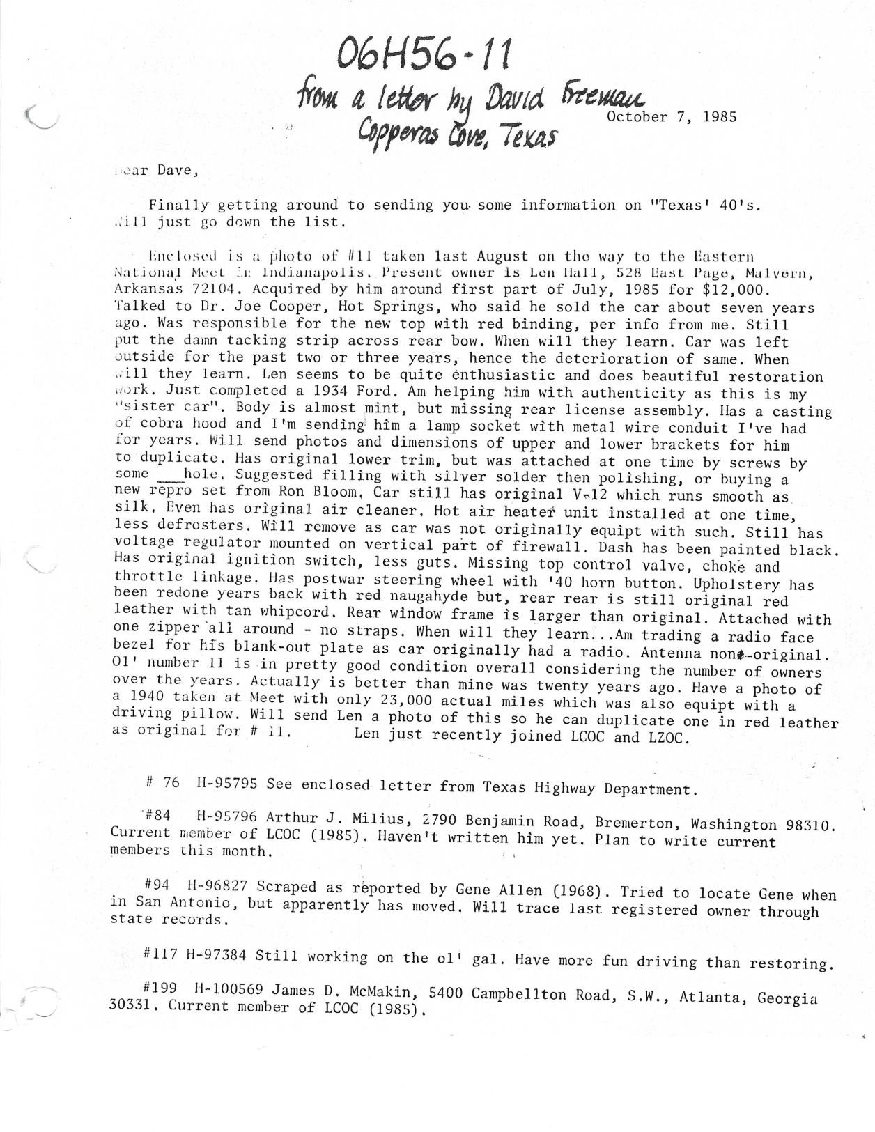 A letter from David Freeman dated October 7, 1985: