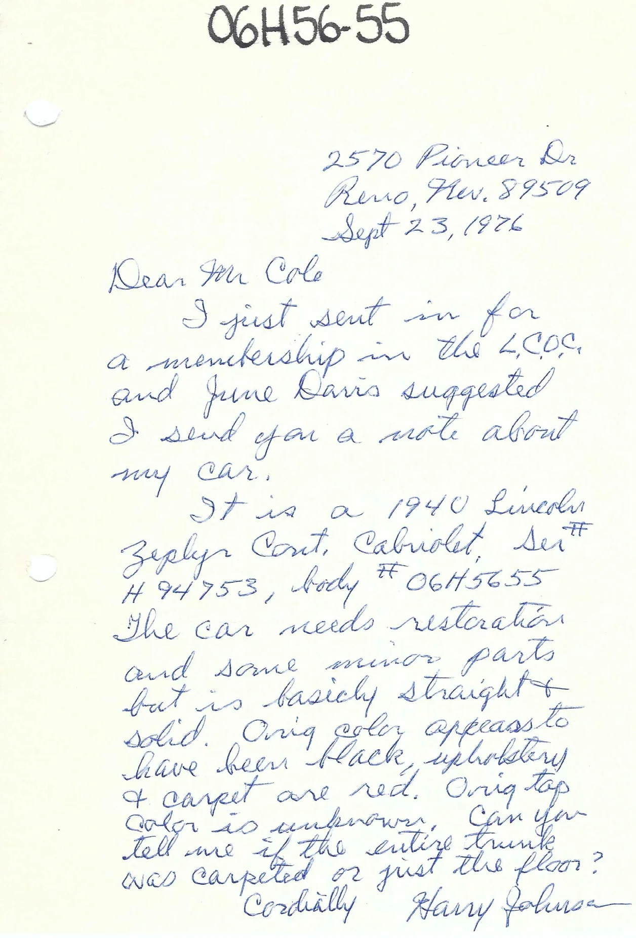 Correspondence from Harry Johnson dated September 23, 1976: