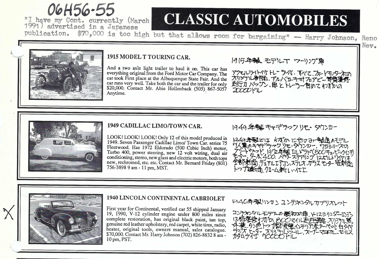 Sale listing and a note posted by Harry Johnson in March 1991: