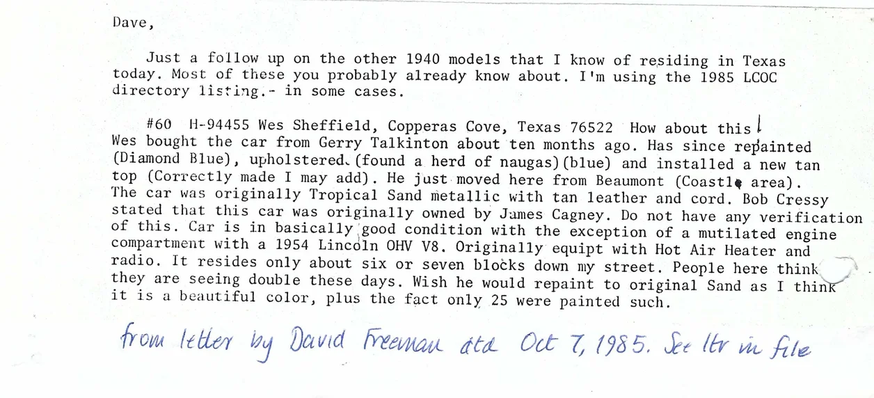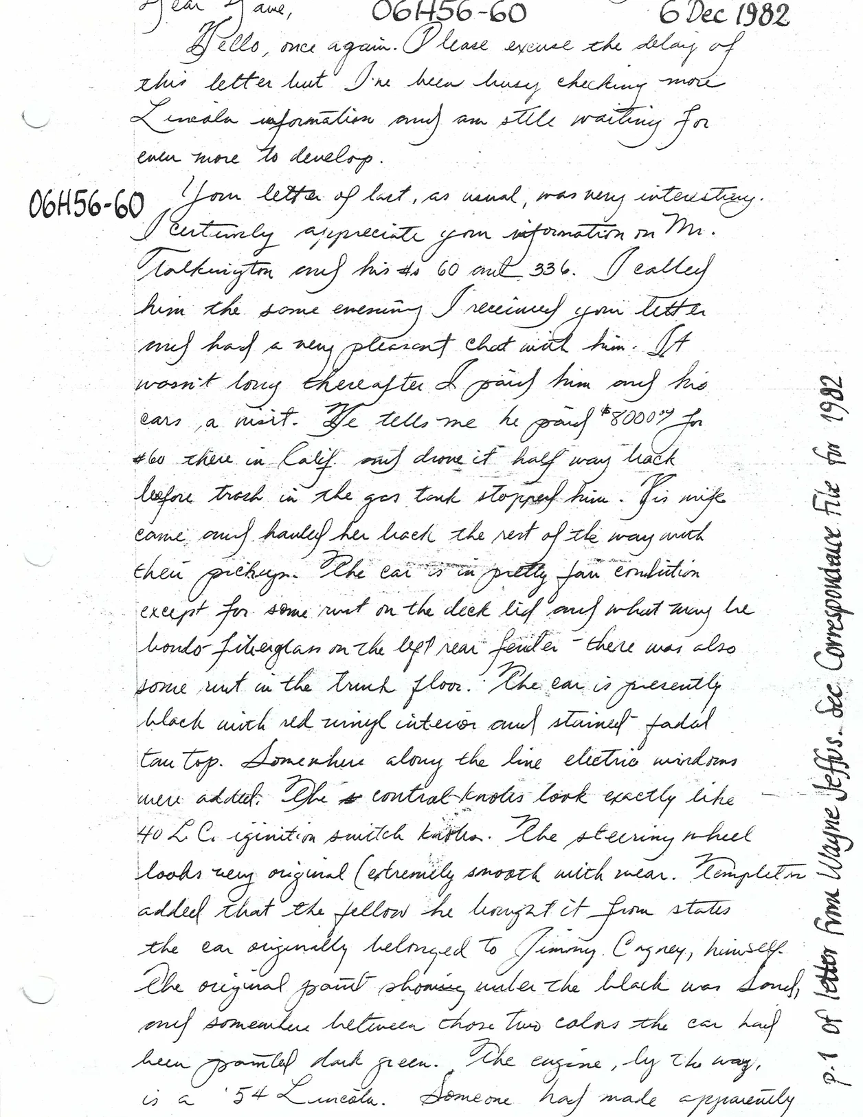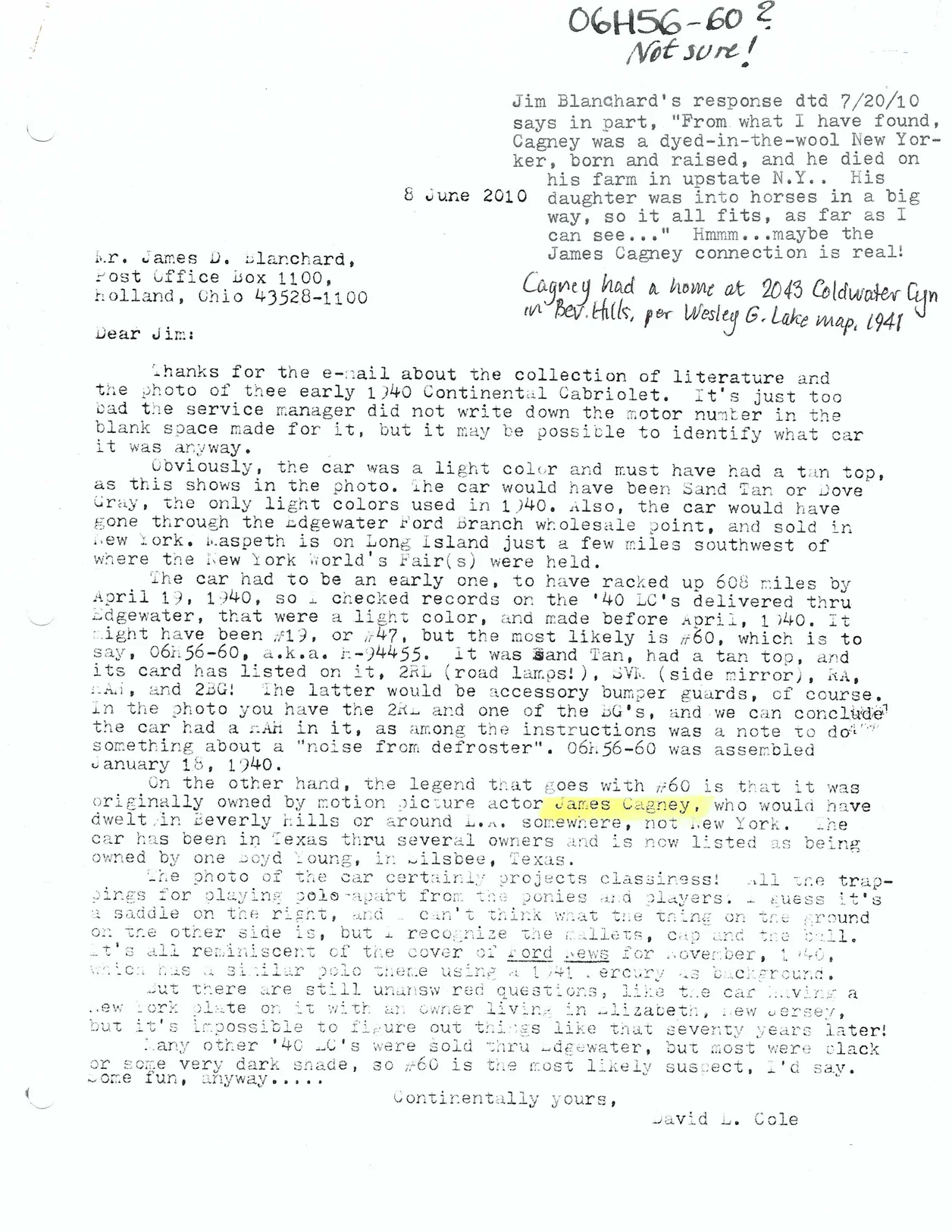 A letter dated June 8, 2010, to Jim Blanchard concerning the likelihood that Jimmy Cagney was the original owner of the car: