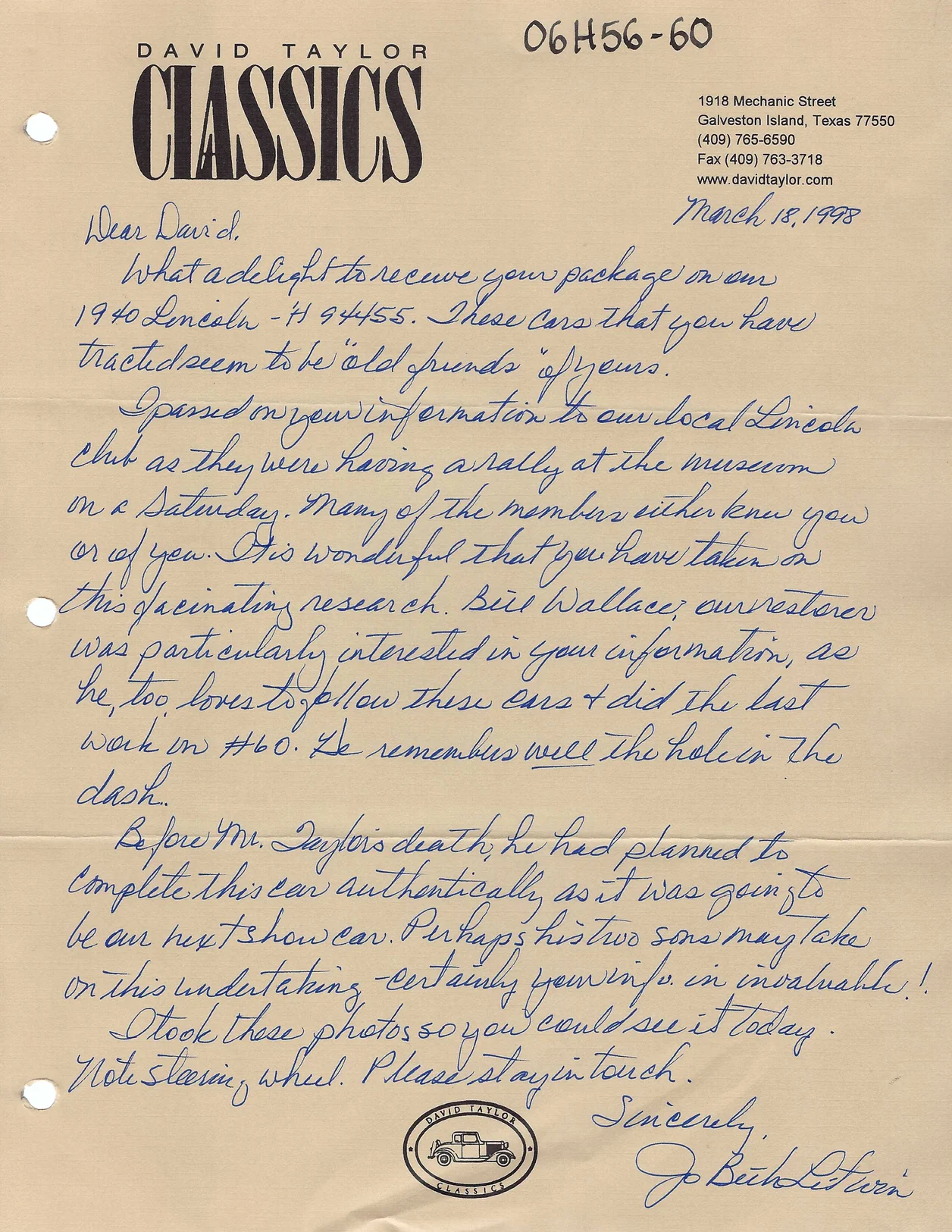 A letter and photos from staff of the David Taylor Classic Car Museum dated March 18, 1998:
