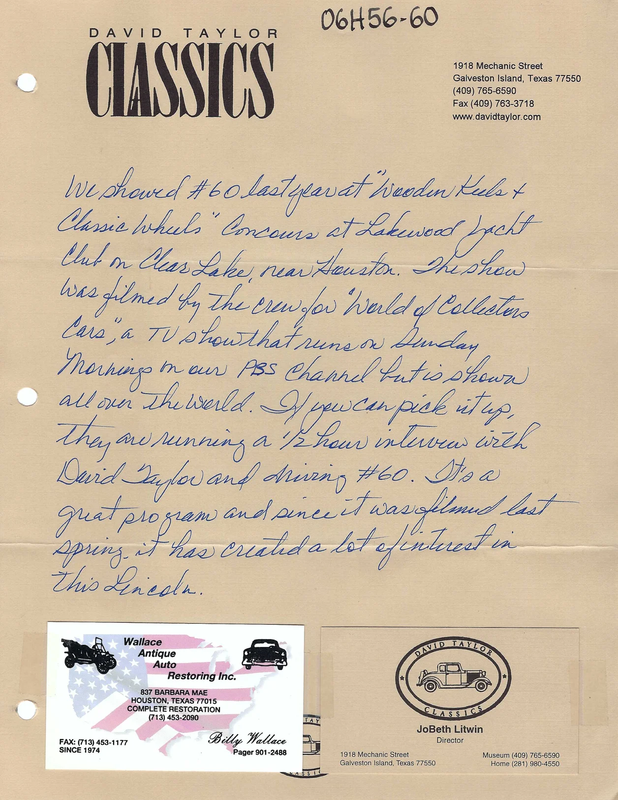 A letter and copy of the car’s Title from staff of the David Taylor Classic Car Museum dated January 6, 1998: