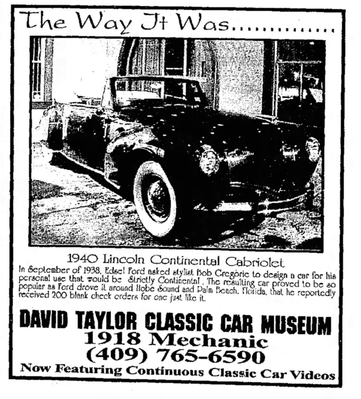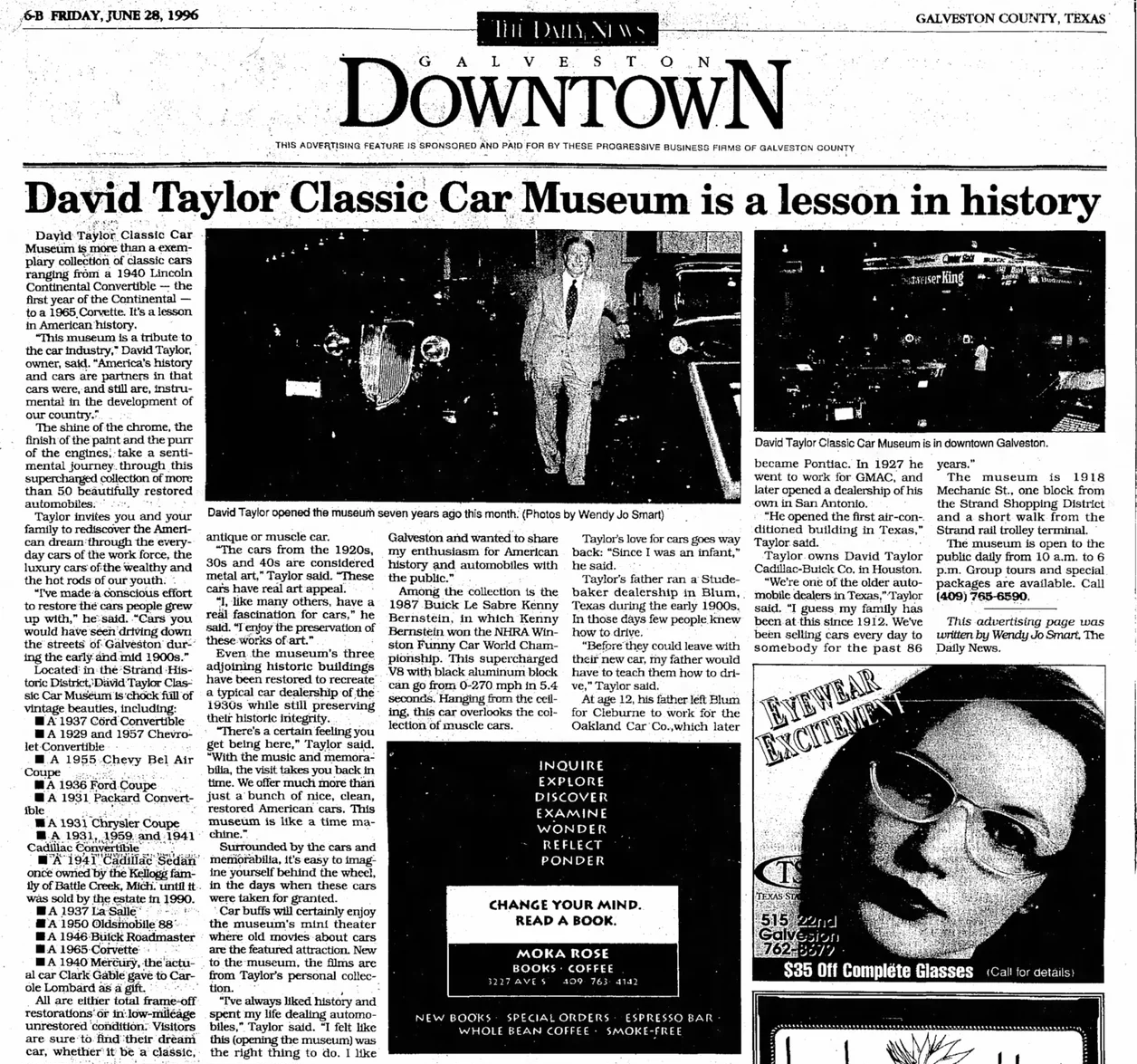 An article on David Taylor and his classic car museum in the local Galveston, TX newspaper dated June 28, 1996: