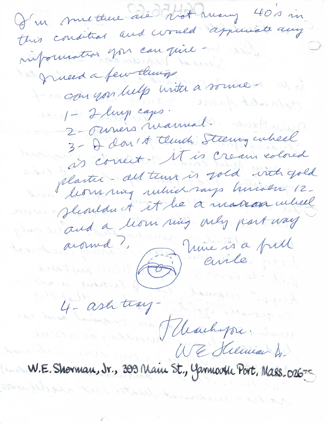 A note from Dave Cole from February 1994 with a transcription of a sale listing in HMN: