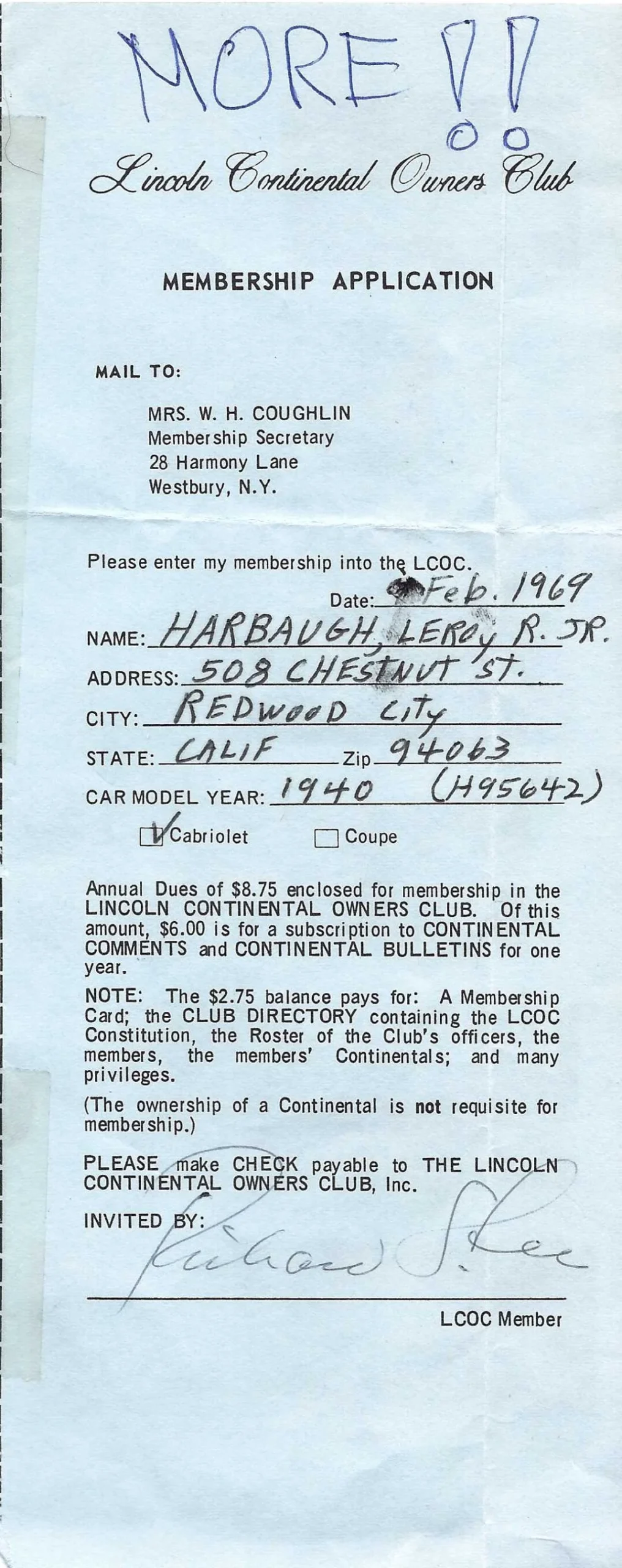 Leroy Harbaugh’s membership application to the LCOC dated February 1969: