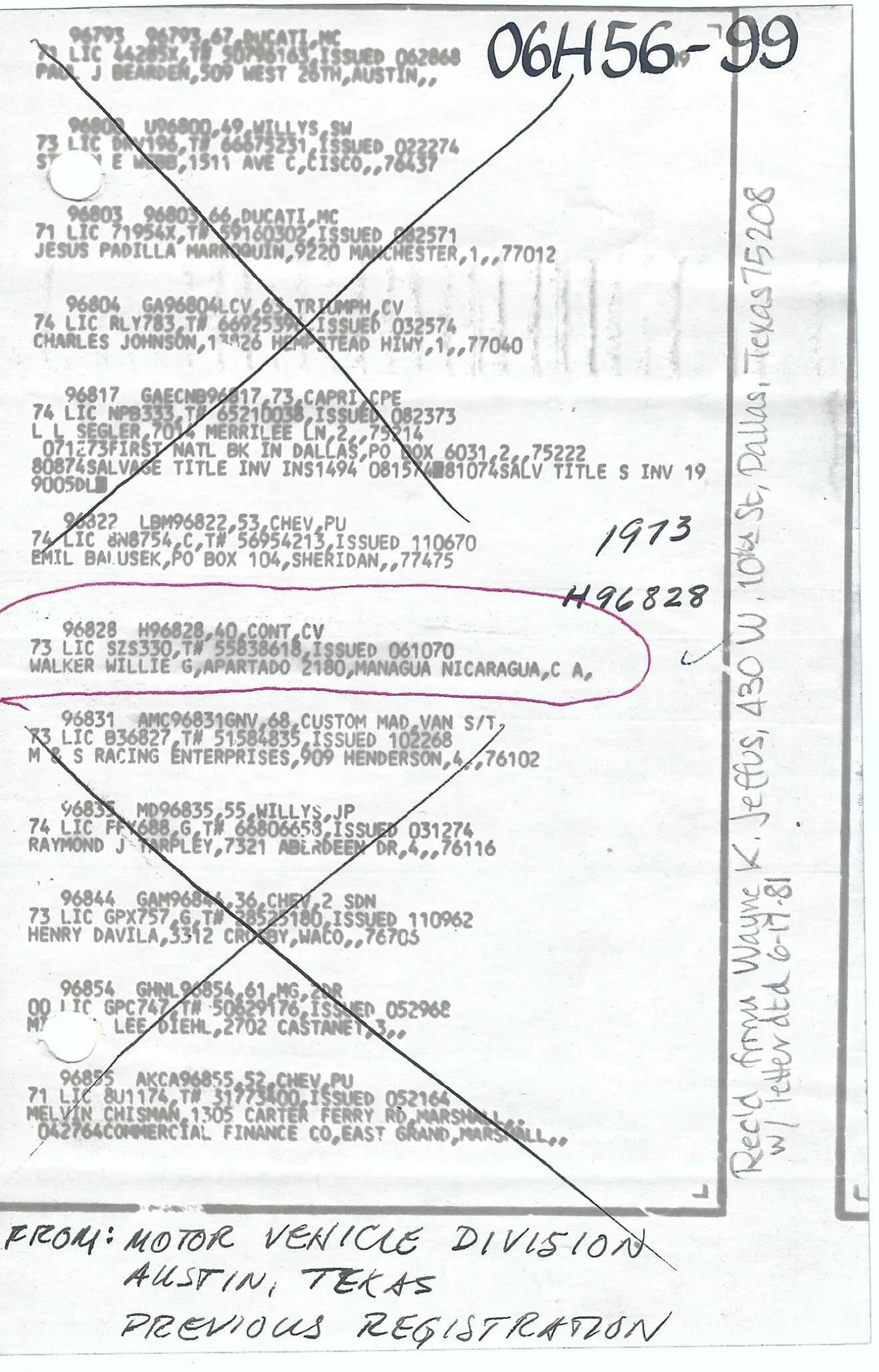 1973 Texas Vehicle Registration record: