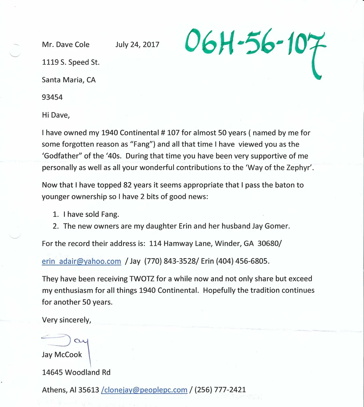 A letter to from Jay McCook dated July 24, 2017: