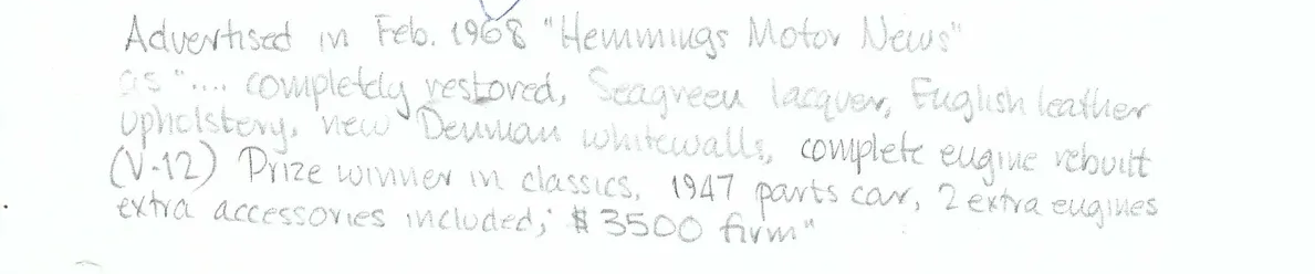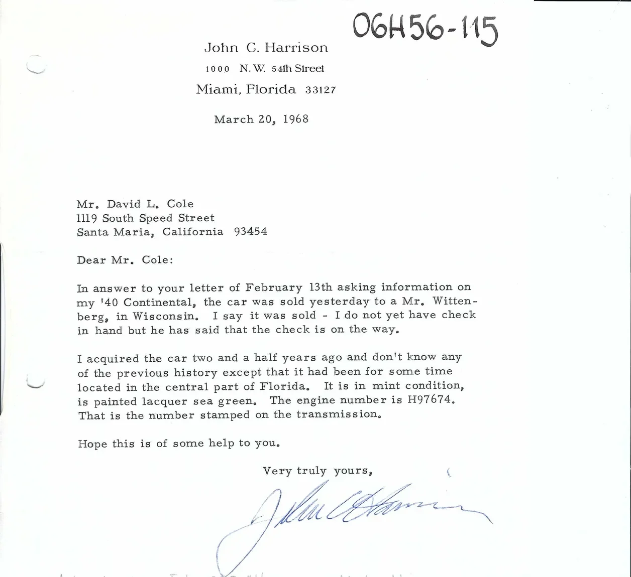 A letter from John Harrison dated March 20, 1968, stating that he had sold the car to Mr. Wittenberg of Wisconsin: