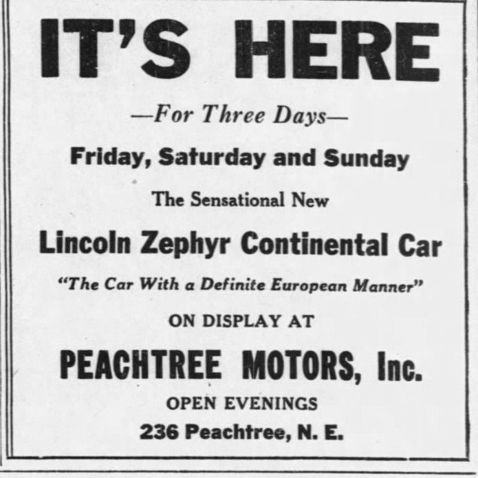 This car was sold through Peachtree Motors. This ad appeared in the Atlanta Constitution on December 14, 1939 announcing that pre-production model #1 was to be displayed at the dealership on December 15, 16, and 17, 1939: