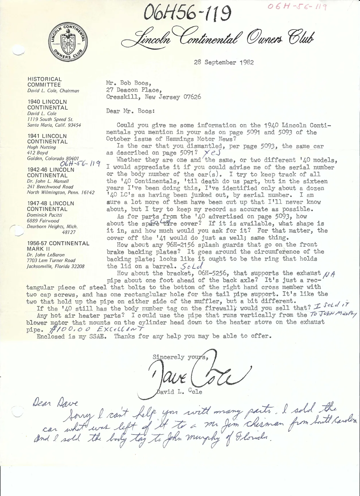 A letter to Bob Boos from DC dated September 28, 1982, with notes of a call with Bob Boos: