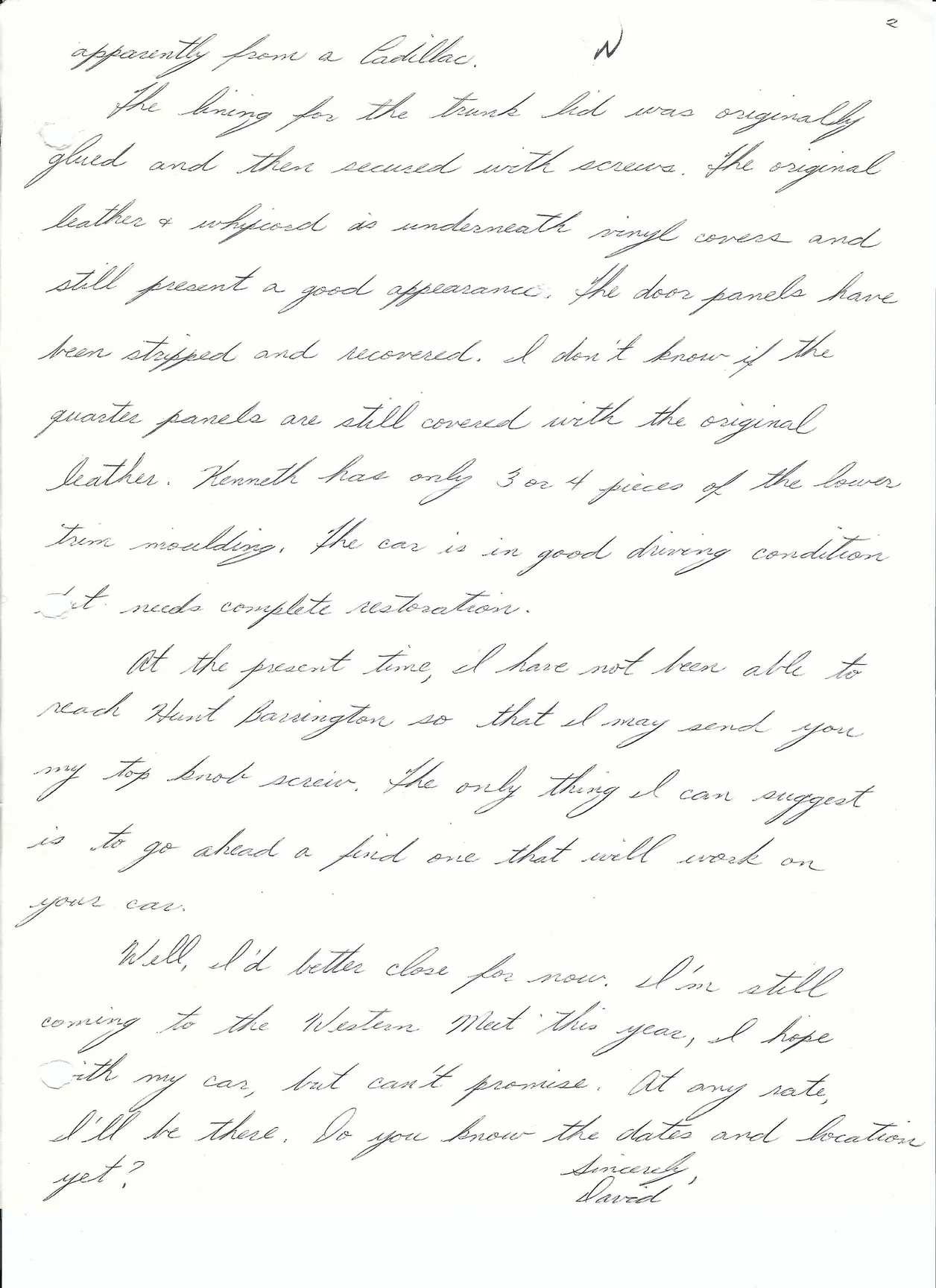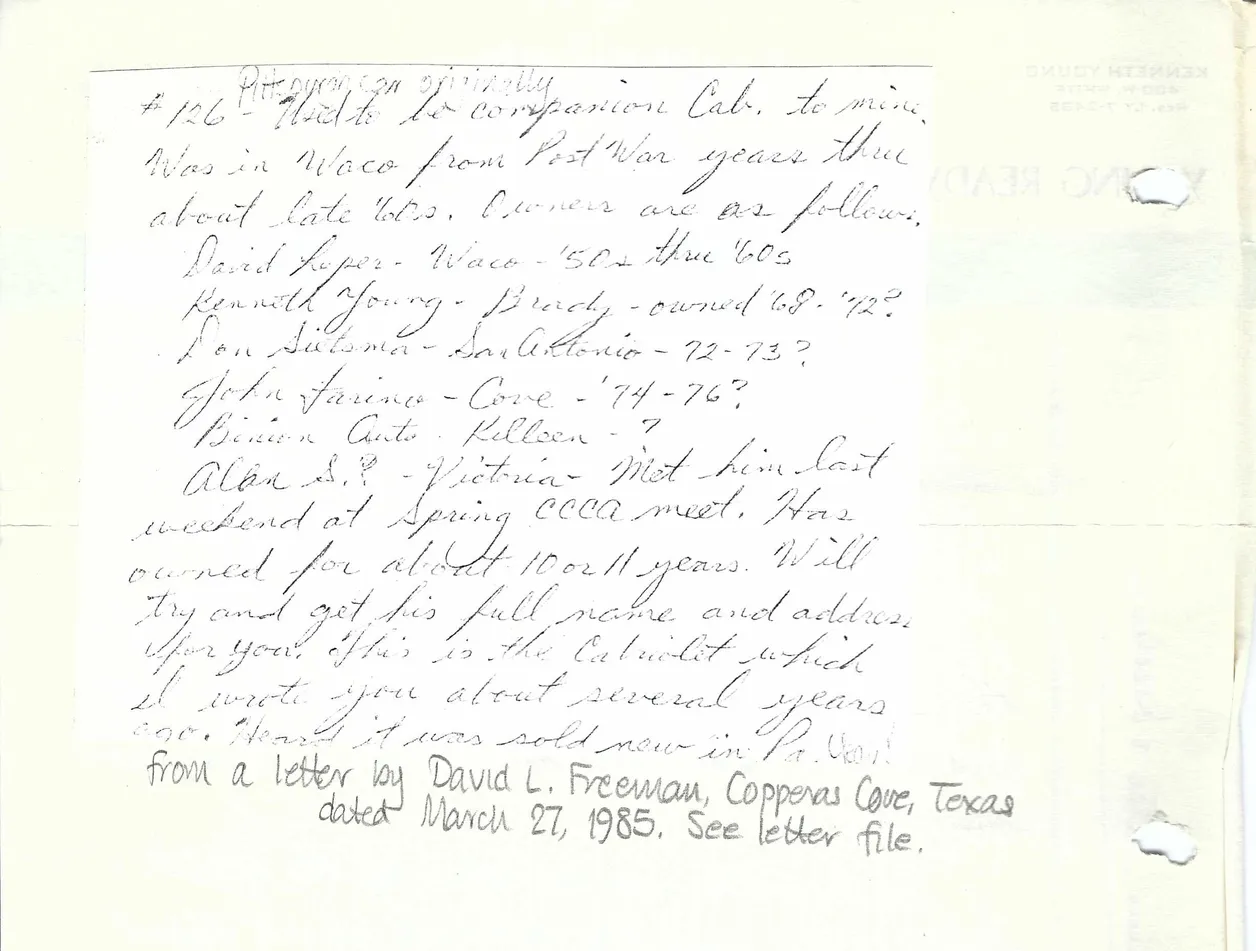 A excerpt from a letter from David Freeman dated March 27, 1985, where he discusses the ownership history of the car: