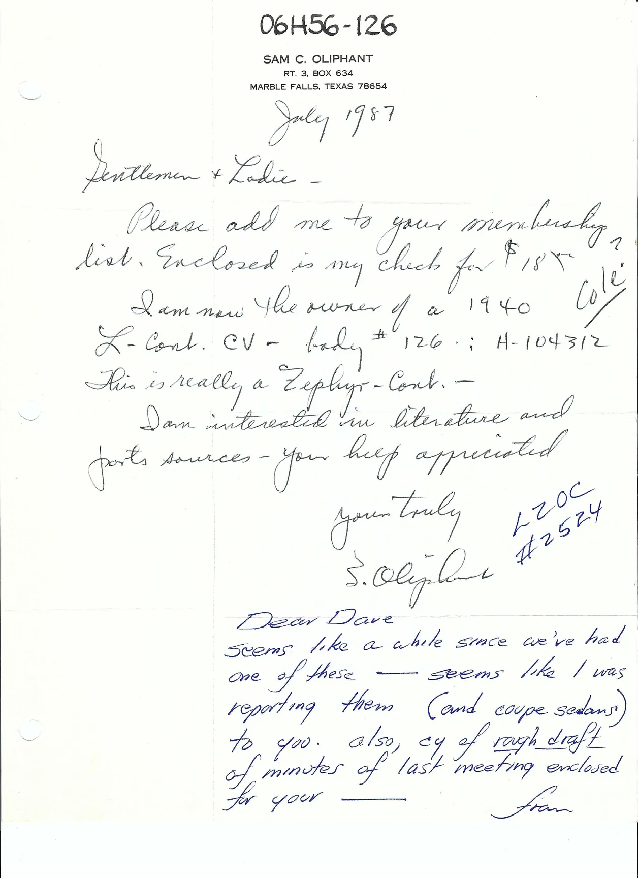 A note from Sam Oliphant dated July 1987: