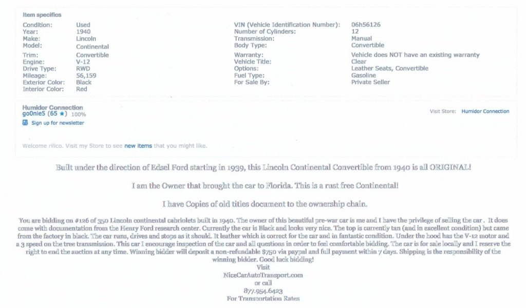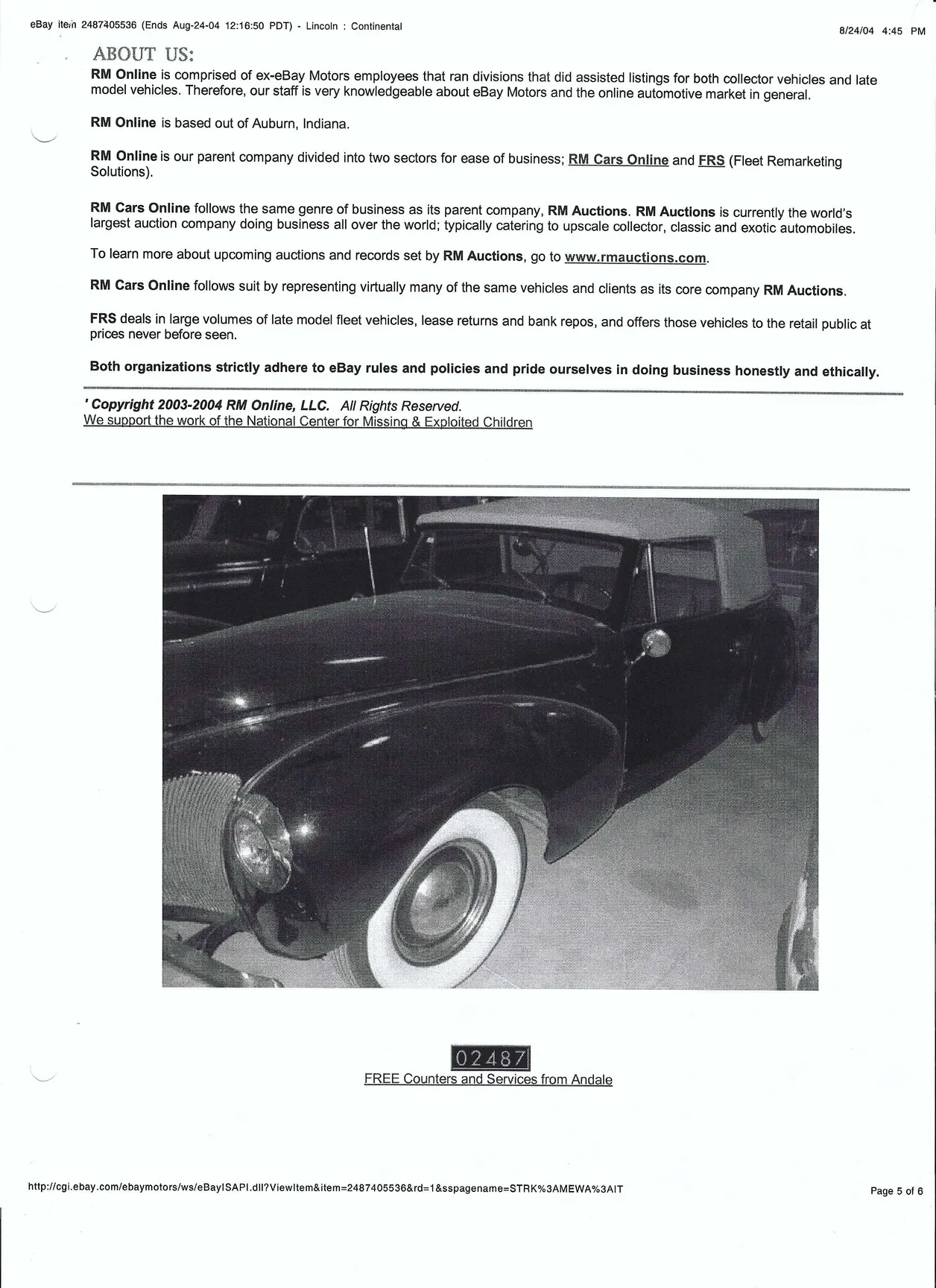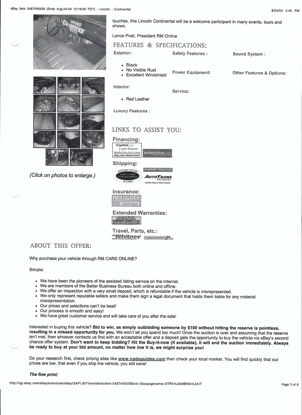 Sale listing from EBay Motors dated August 2004: