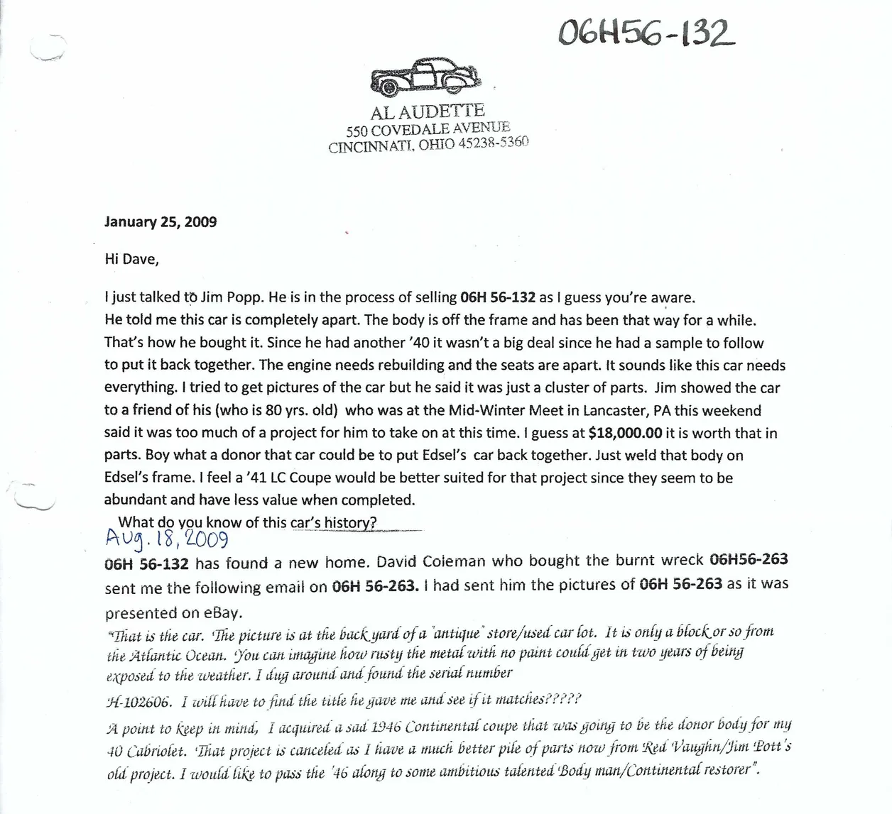 Two notes from Al Audette on ownership dated January and August 2009: