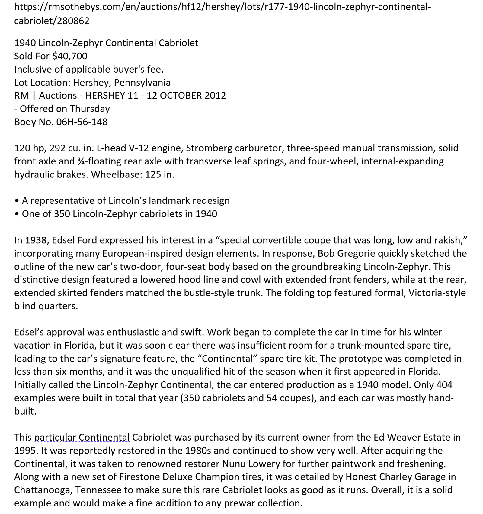 Sale listing RM Sotheby’s Auction At Hershey October 2012: