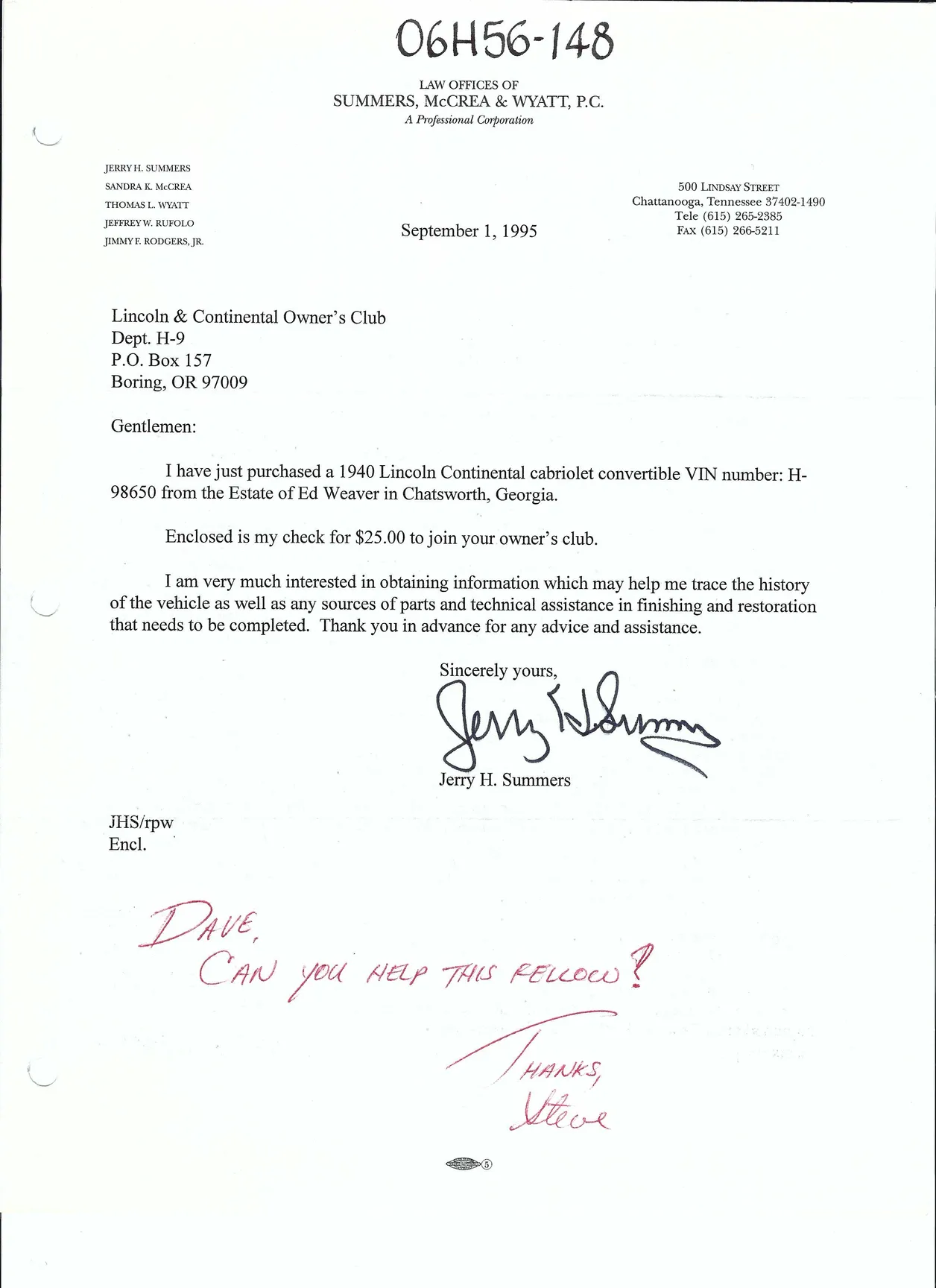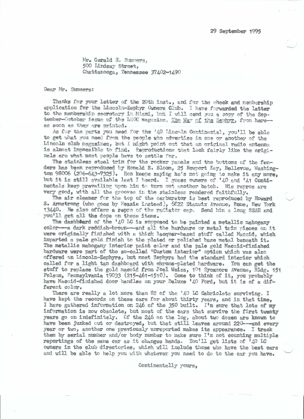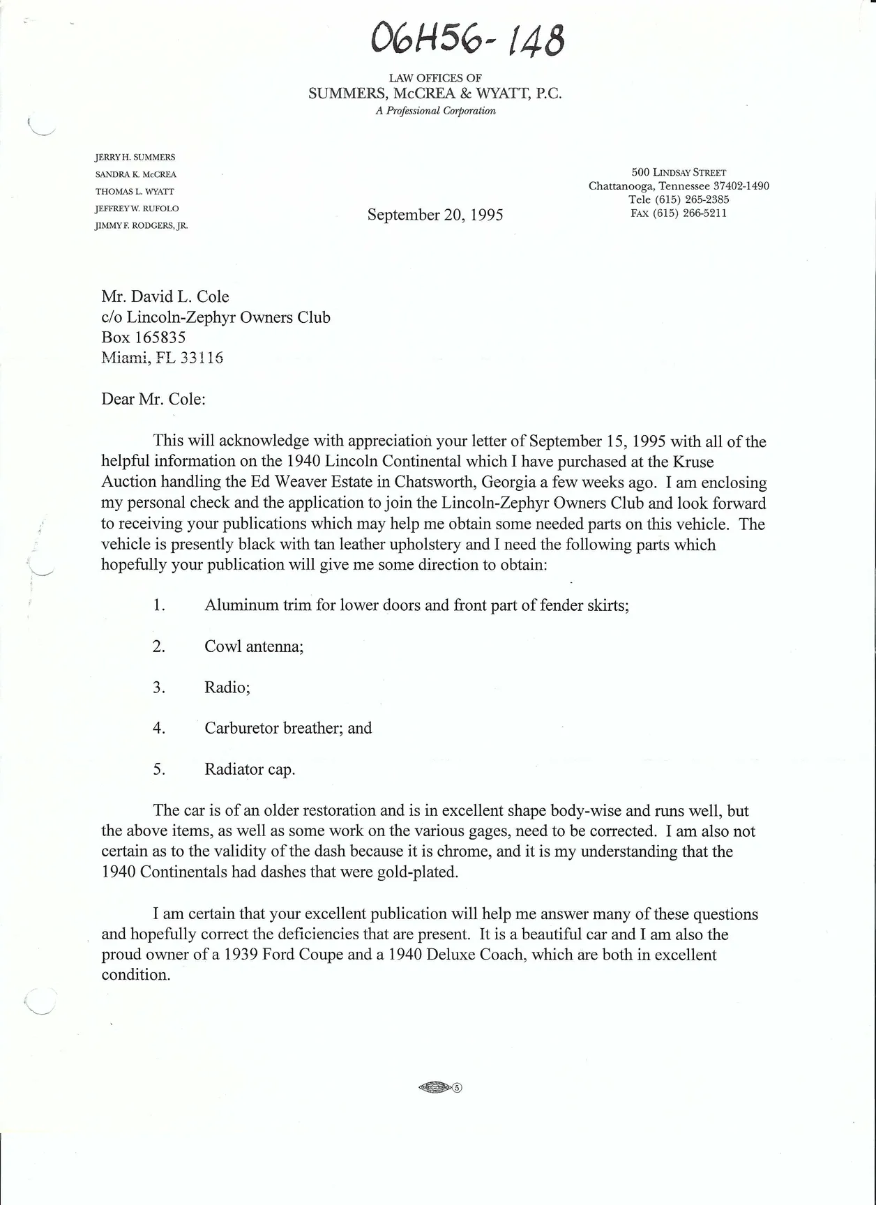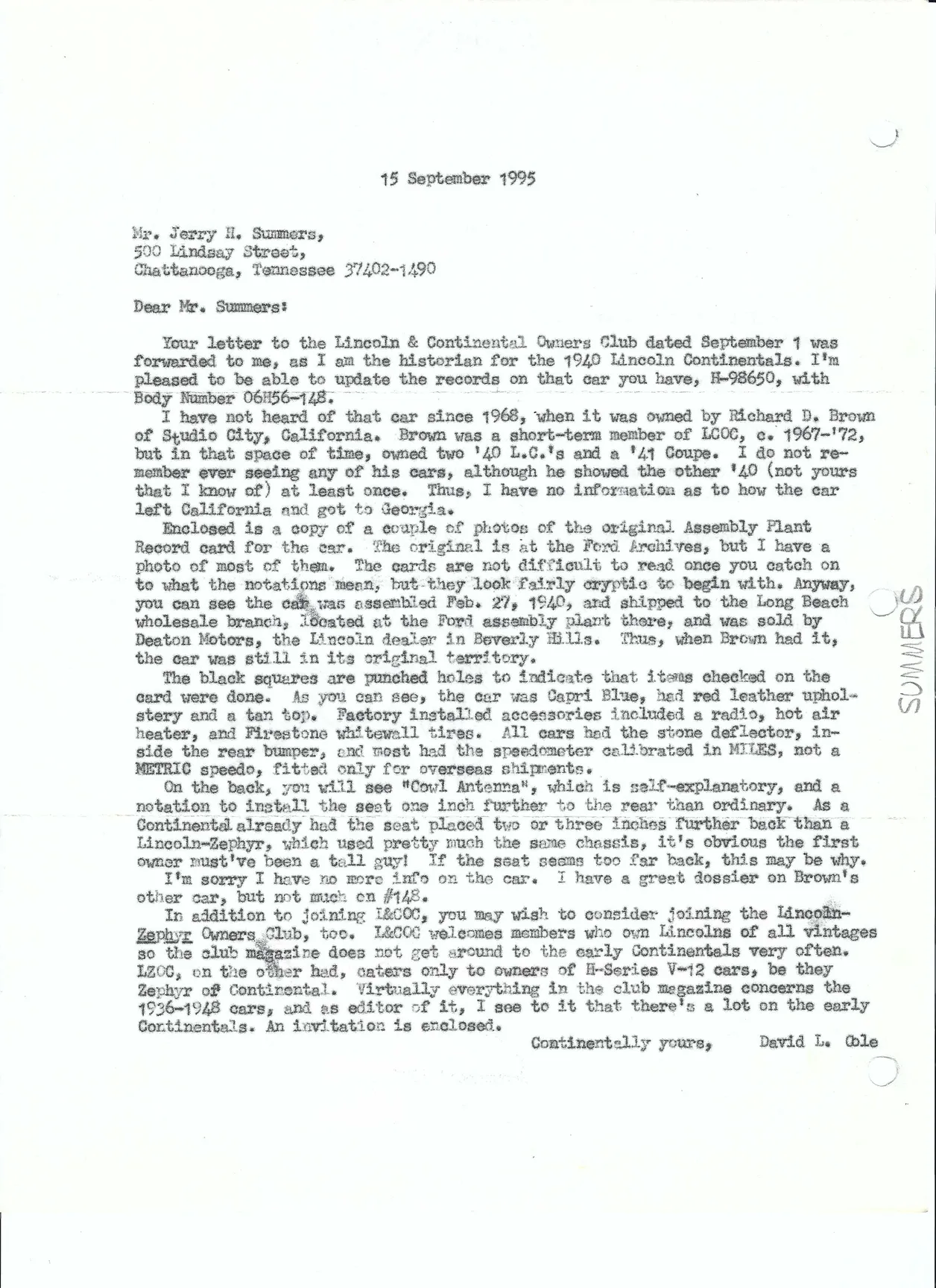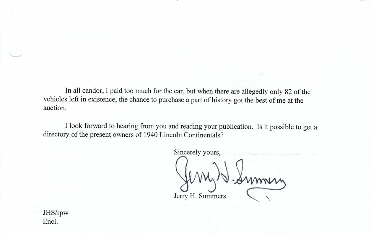 A letter from Jerry Summers dated September 1, 1995, announcing his purchase of the car: