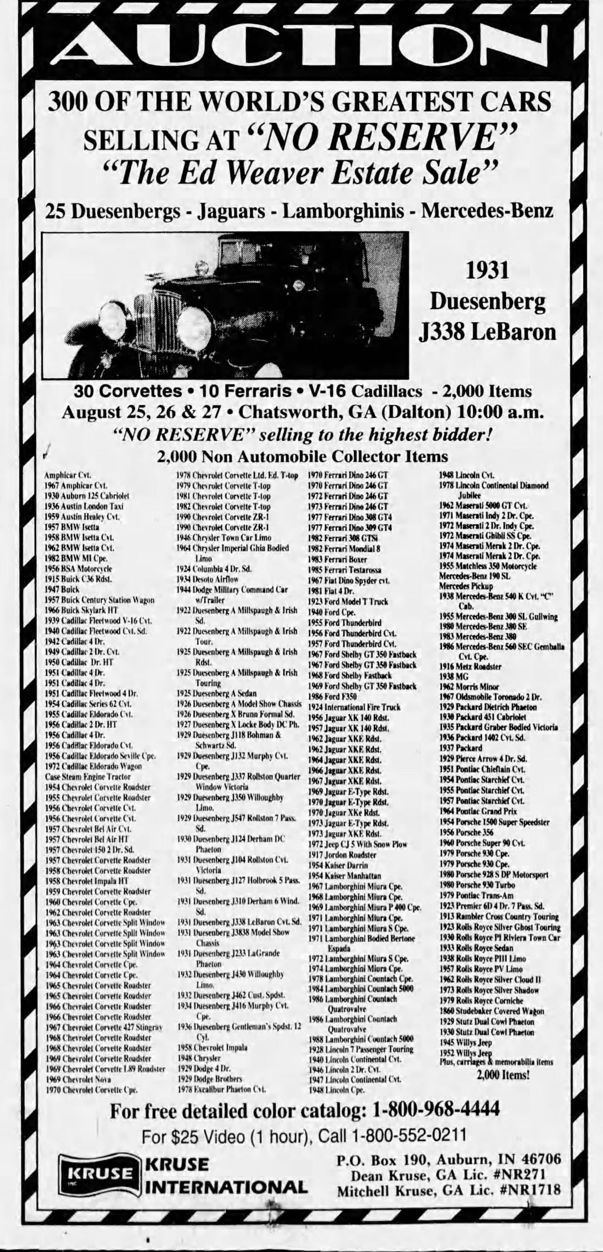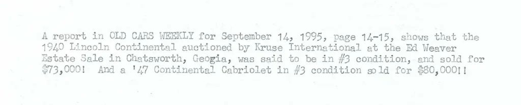 A newspaper ad announcing the Ed Weaver estate sale that took place on August 25-27, 1995, where the car was sold: