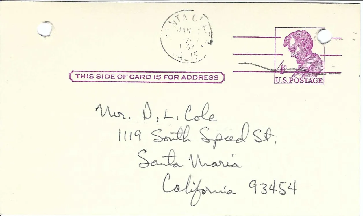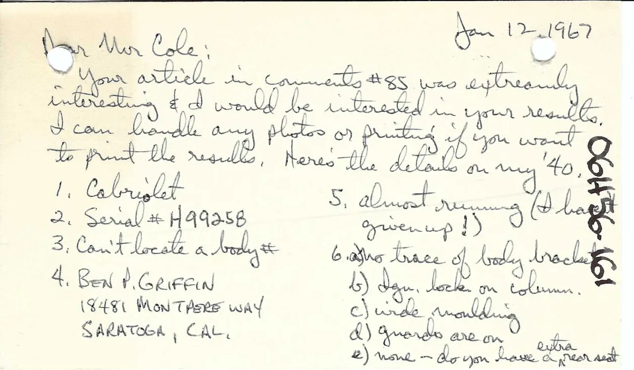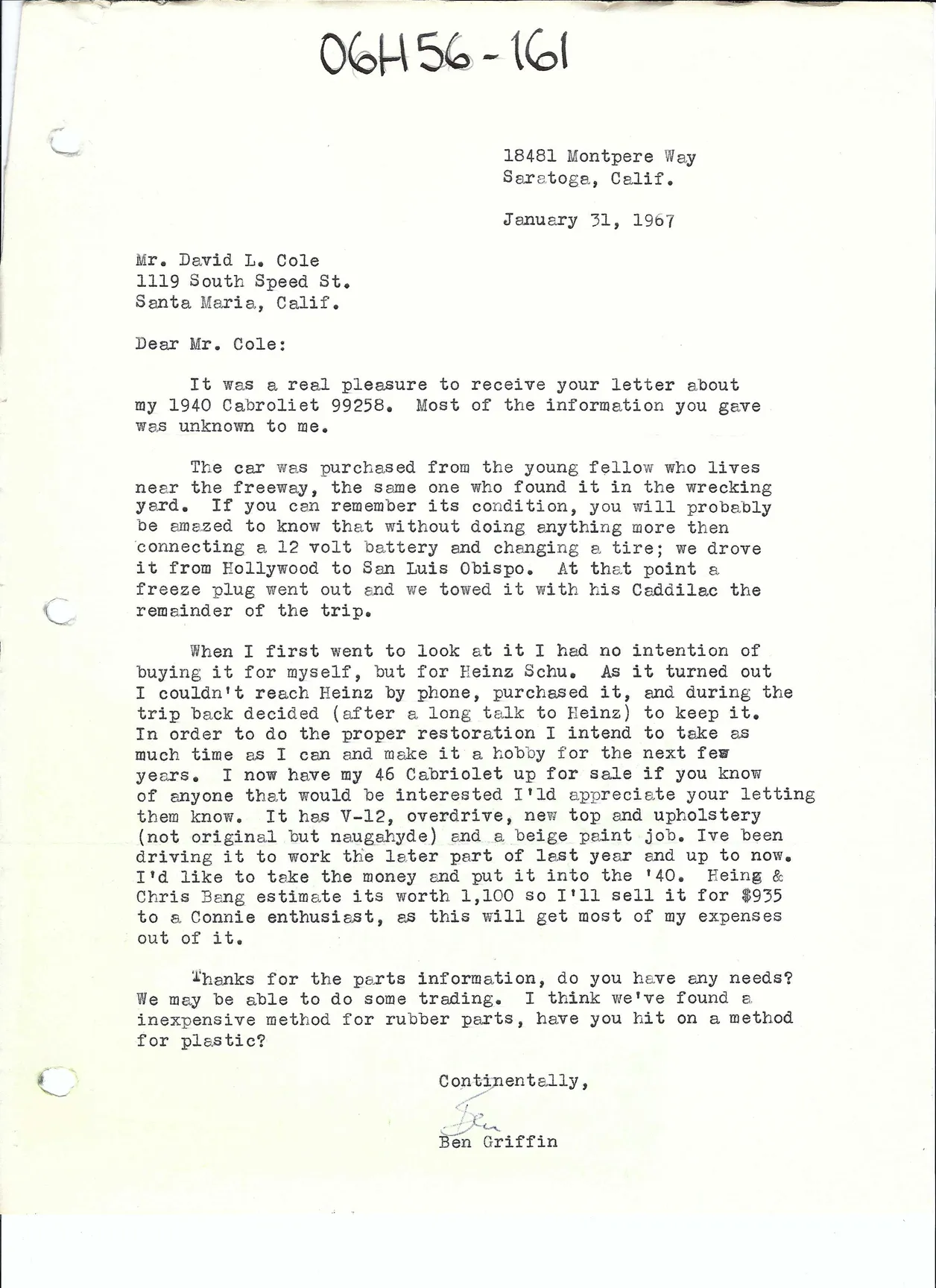 A letter from Ben Griffin dated January 31, 1967, describing his acquisition of the car: