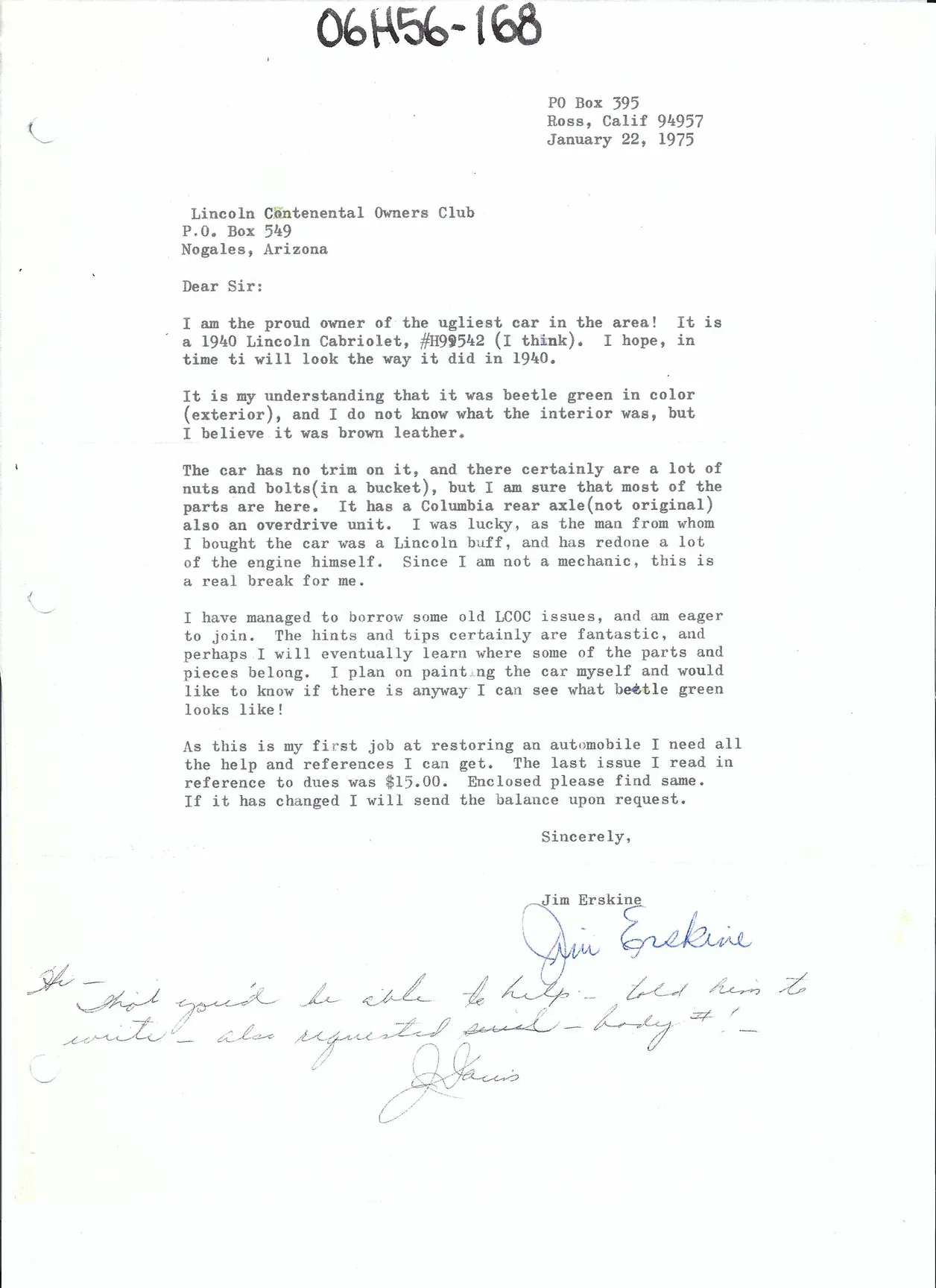 A letter from Jim Erskine dated January 22, 1975, announcing his ownership of the car: