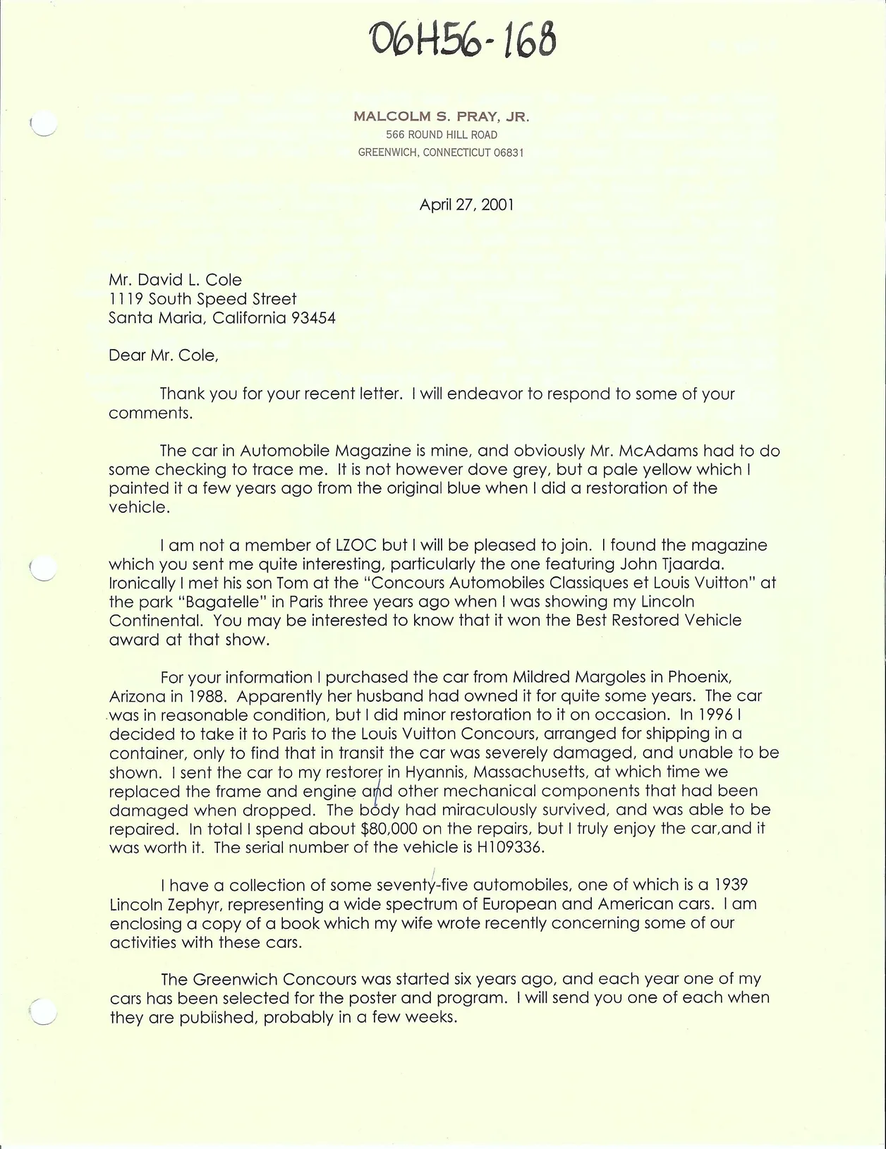 A letter from Malcolm Pray dated April 27, 2001, describing the accident involving the car: