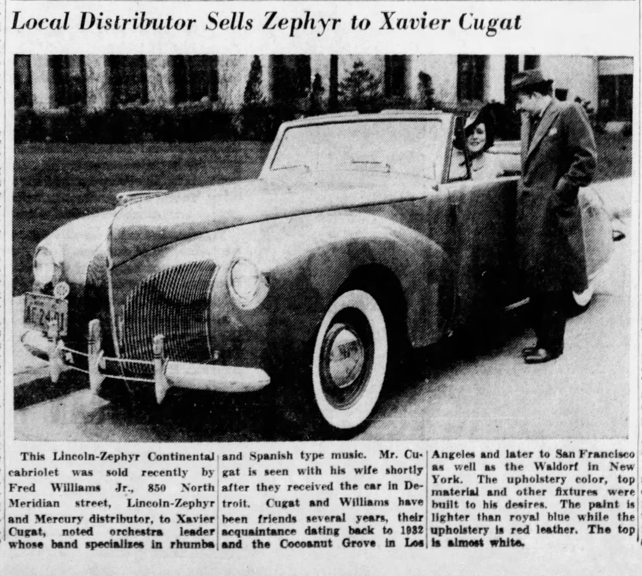 Xavier Cugat purchased a 1940 Continental Cabriolet from Indianapolis, IN-based dealer Fred Williams, Jr., which he picked up in Detroit.  The car was described as “paint in lighter than royal blue” with red leather upholstery and an almost white top.  The photo shows the car equipped with a center-front bumper guard and a cowl antenna.