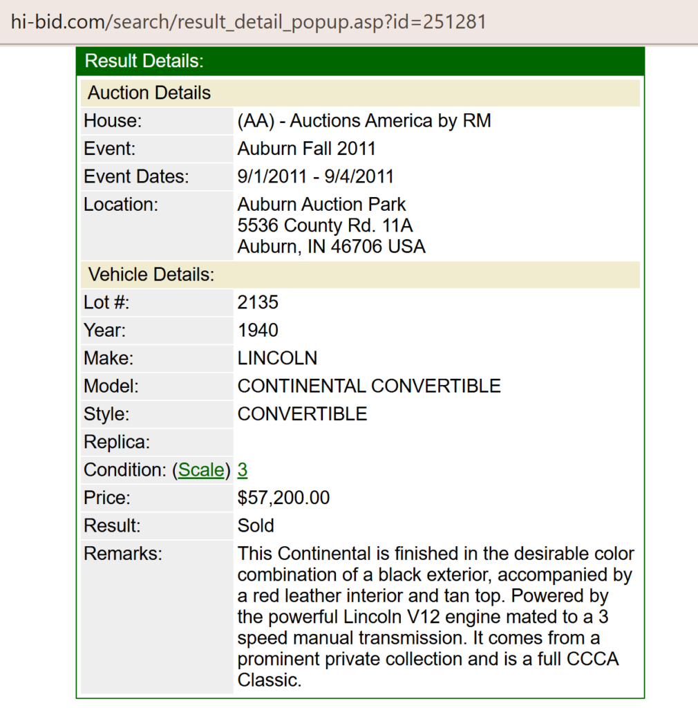 Sale Result in 2011 by RM Sotheby’s Auctions at Auburn, IN: