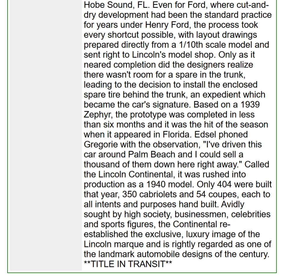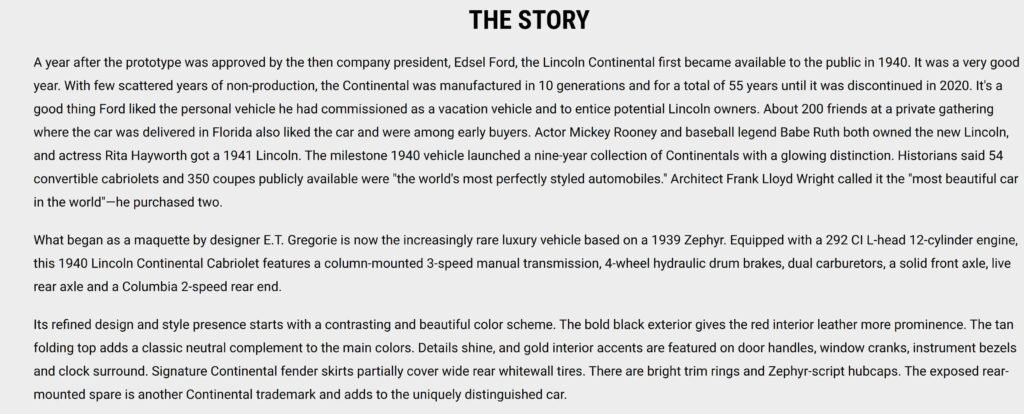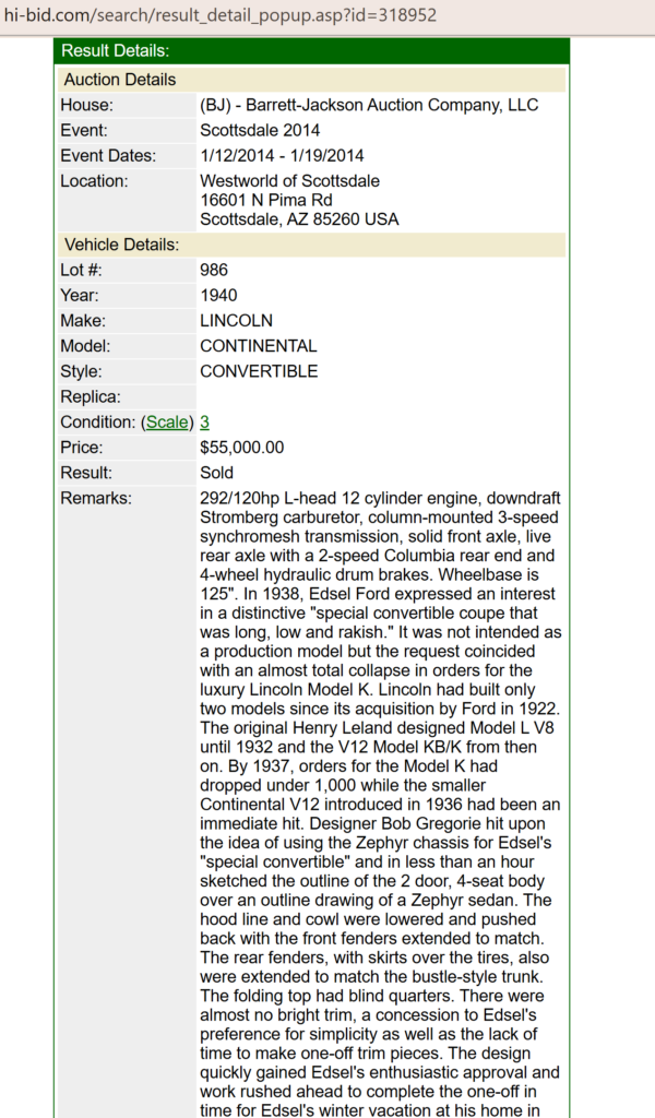 Photos accompanying the sale listing in 2014 by Barrett-Jackson Auctions at Scottsdale, AZ: