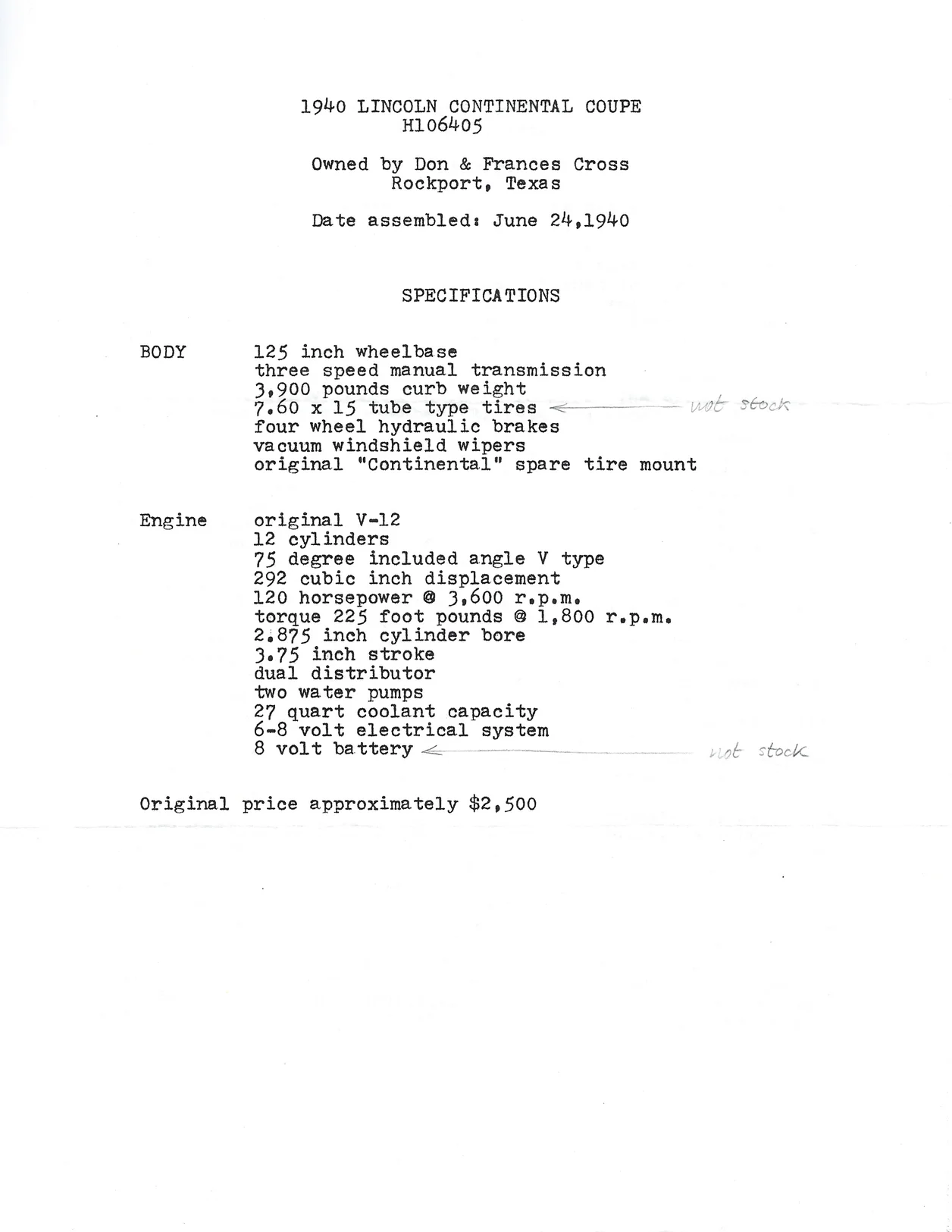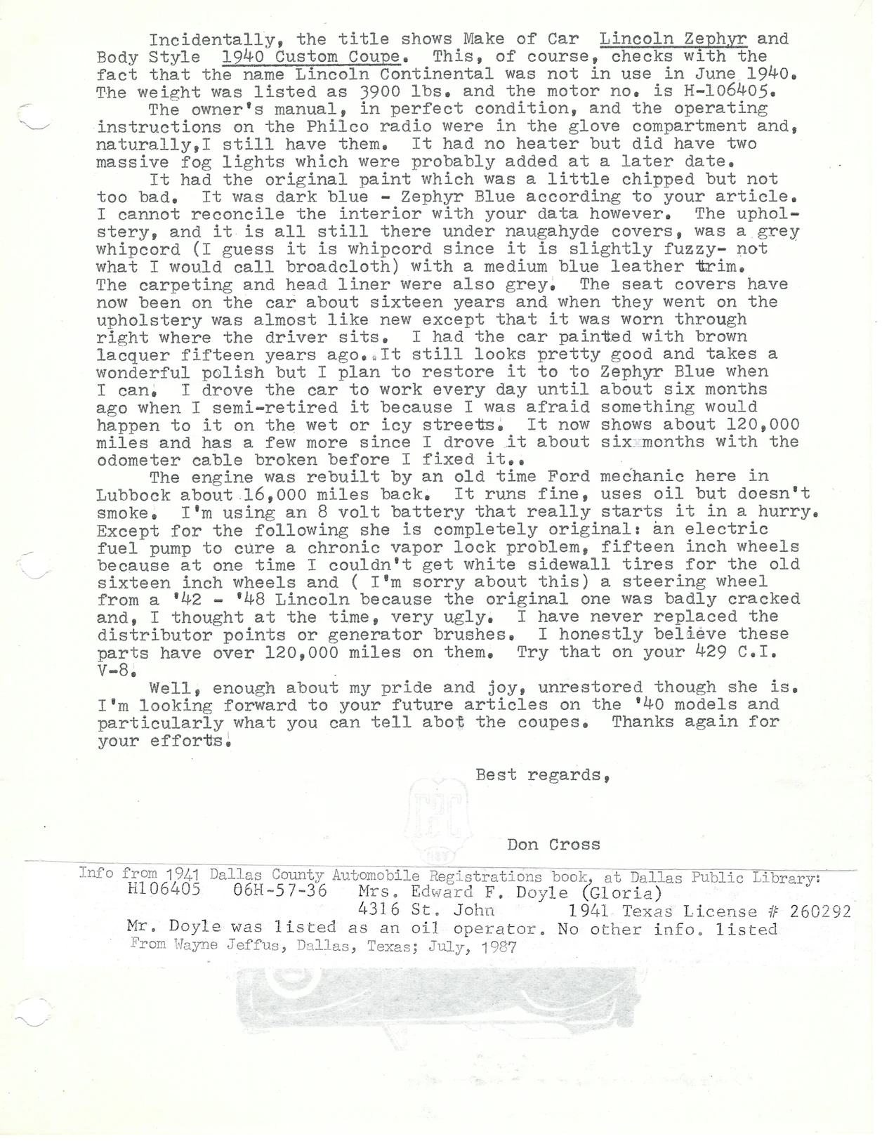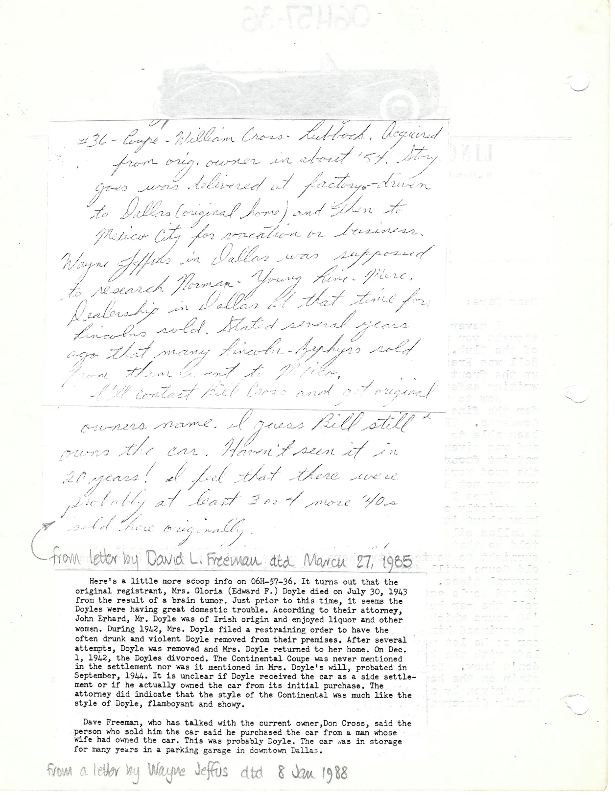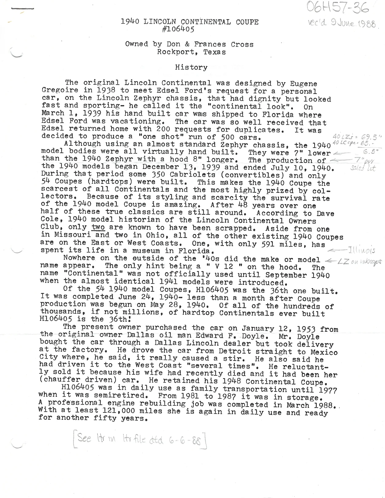Car history written by Don Cross and dated June 1988: