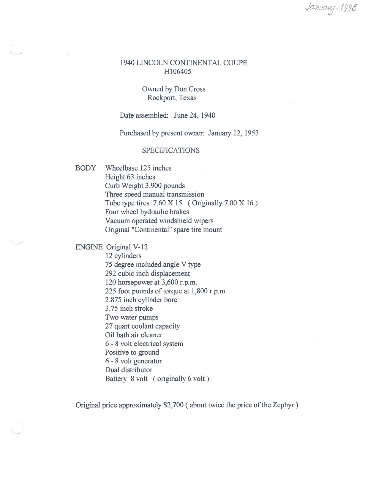 Car history written by Don Cross and dated June 1998