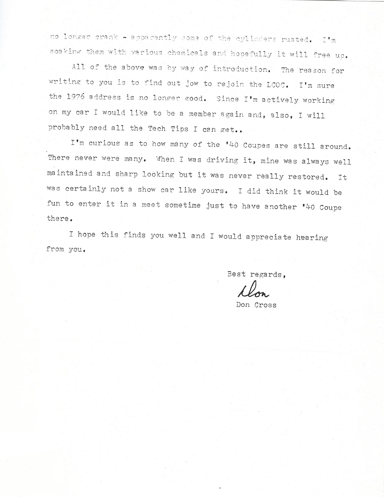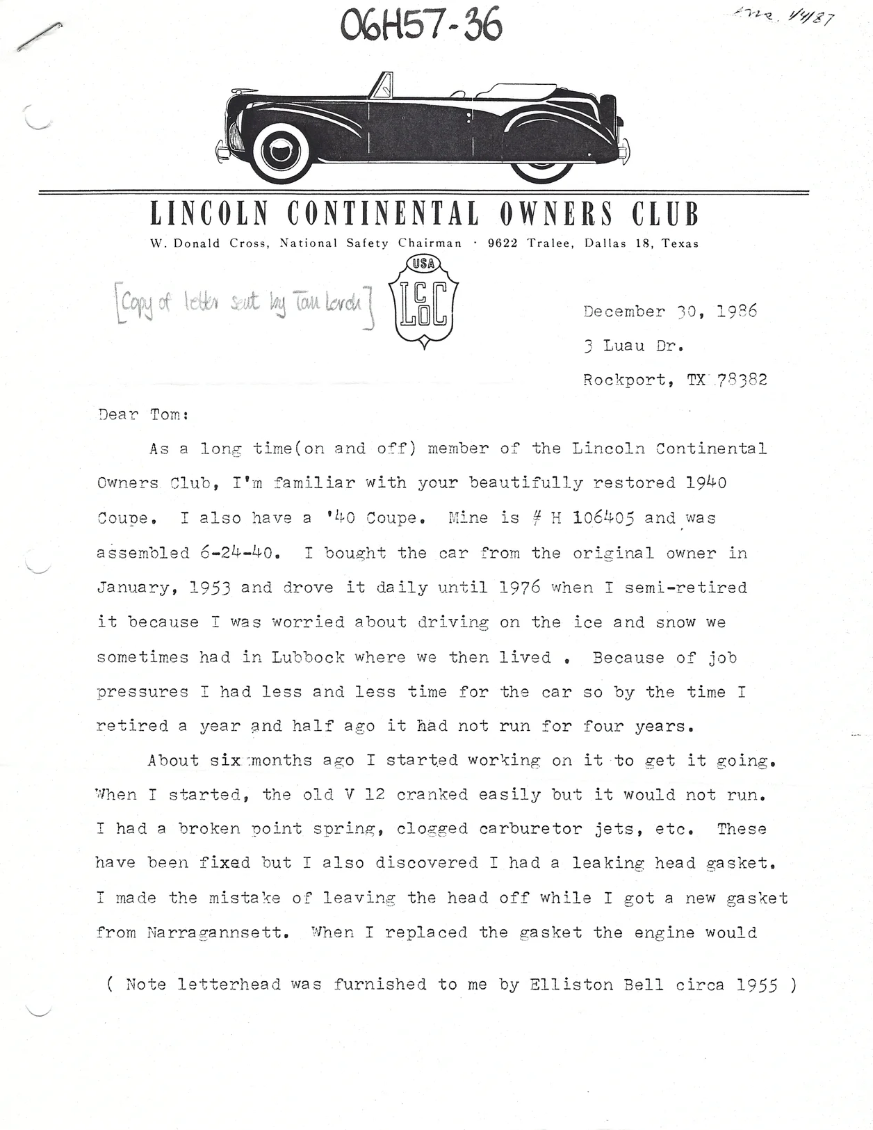 Correspondence from Don Cross To Tom Lerch dated December 30, 1986:
