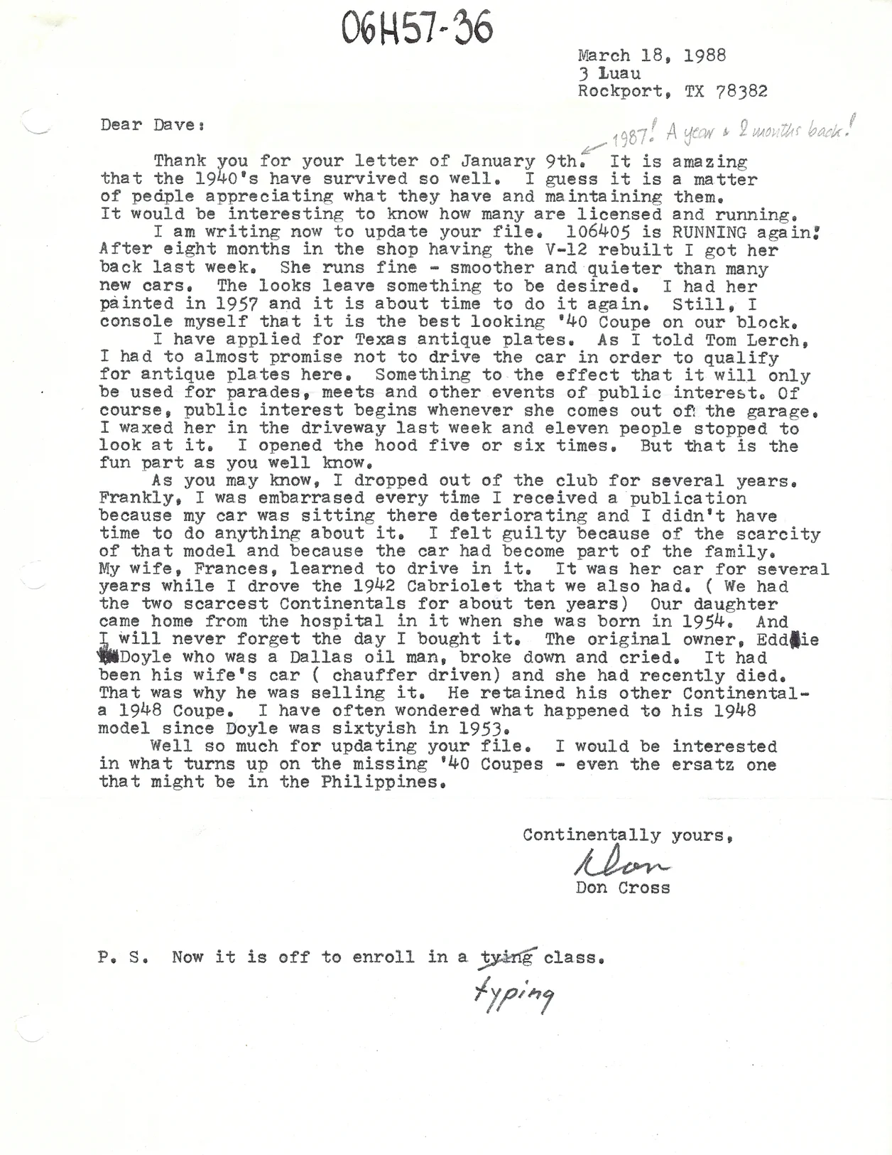Correspondence from Don Cross and dated March 18, 1988: