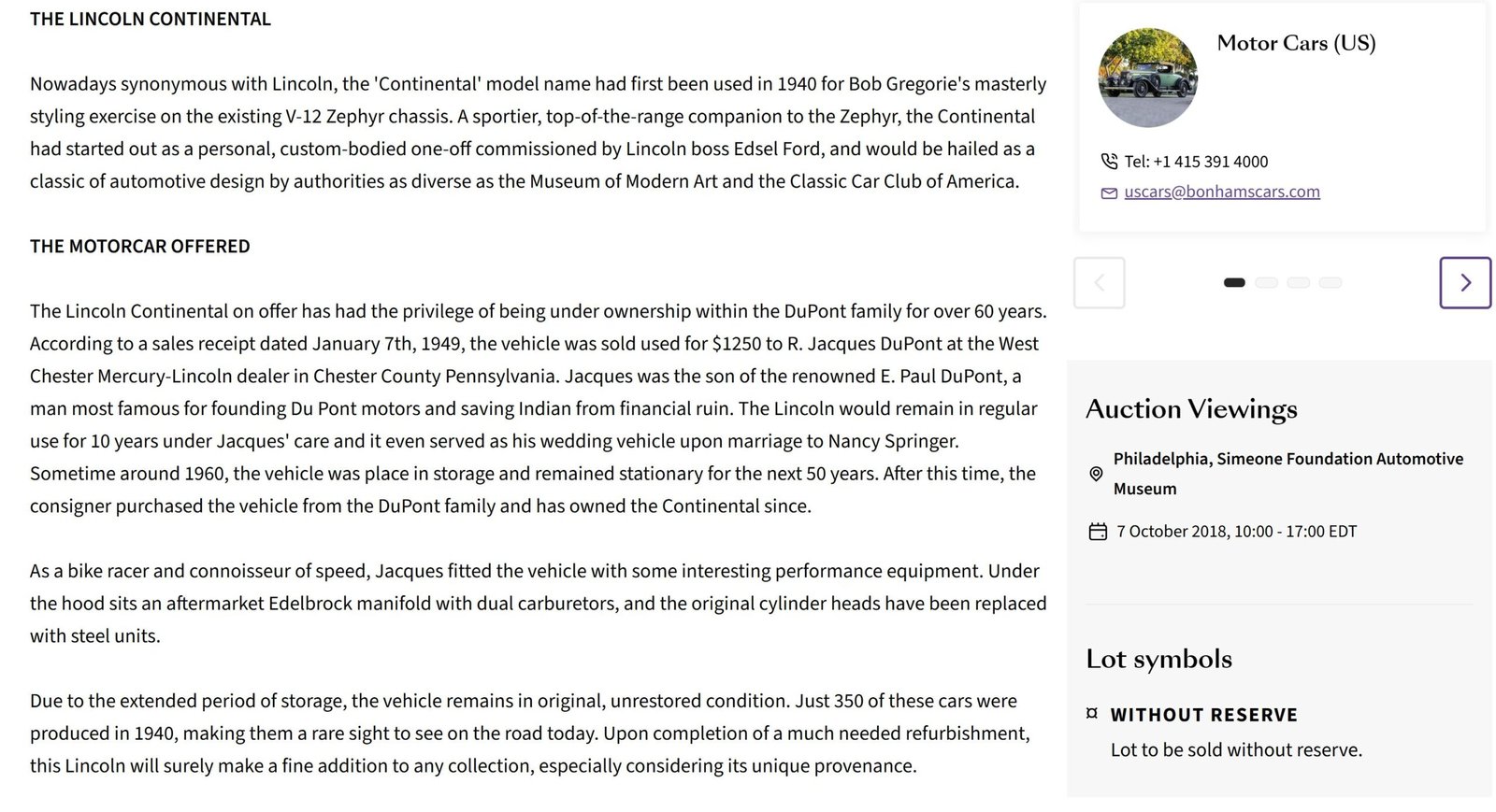 Sale listing by Bonhams Auction in October 2018 at Philadelphia, PA: