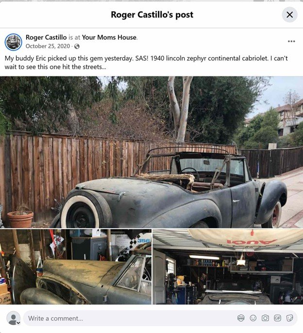 Facebook post in October 2020 announcing Eric’s purchase of the car: