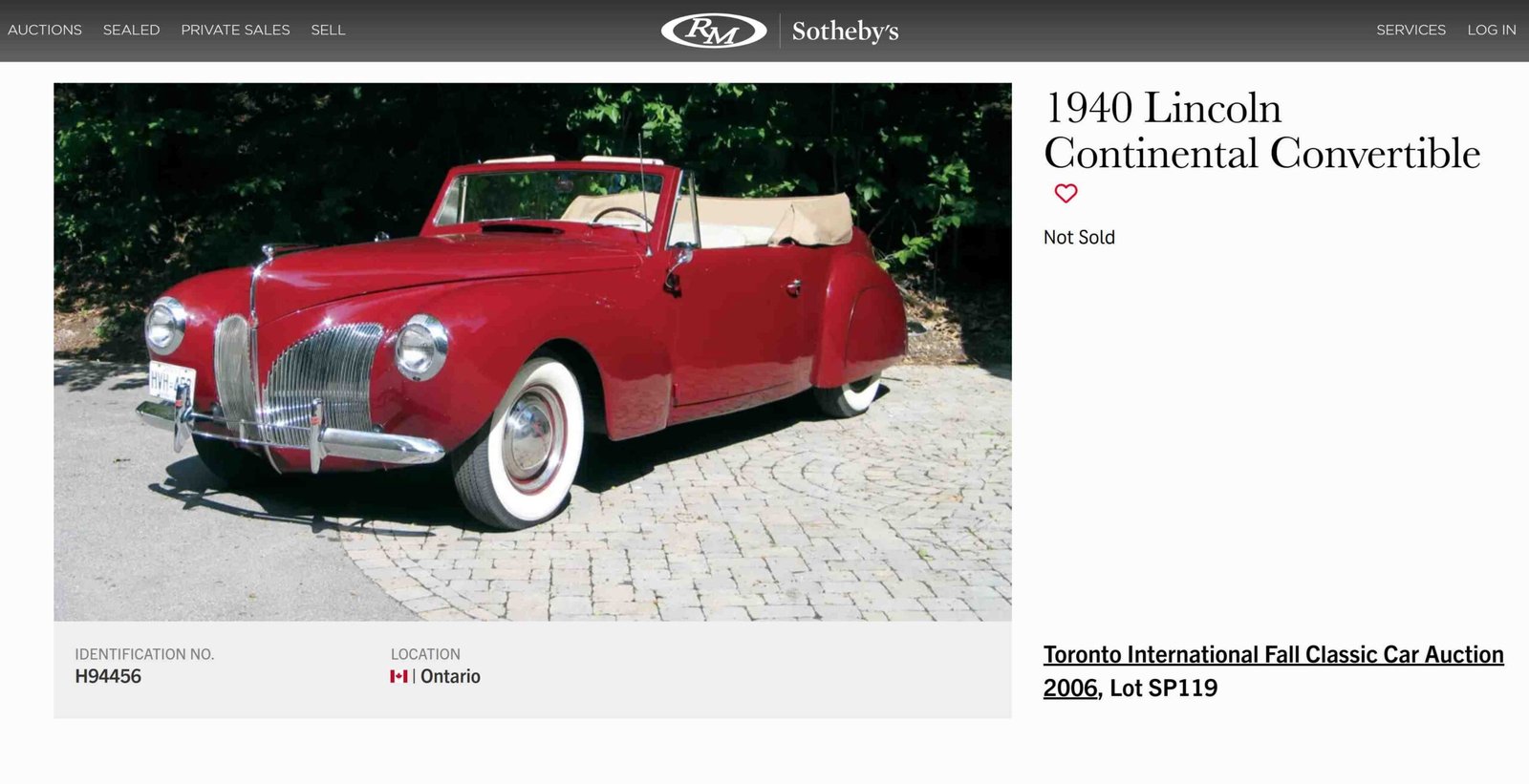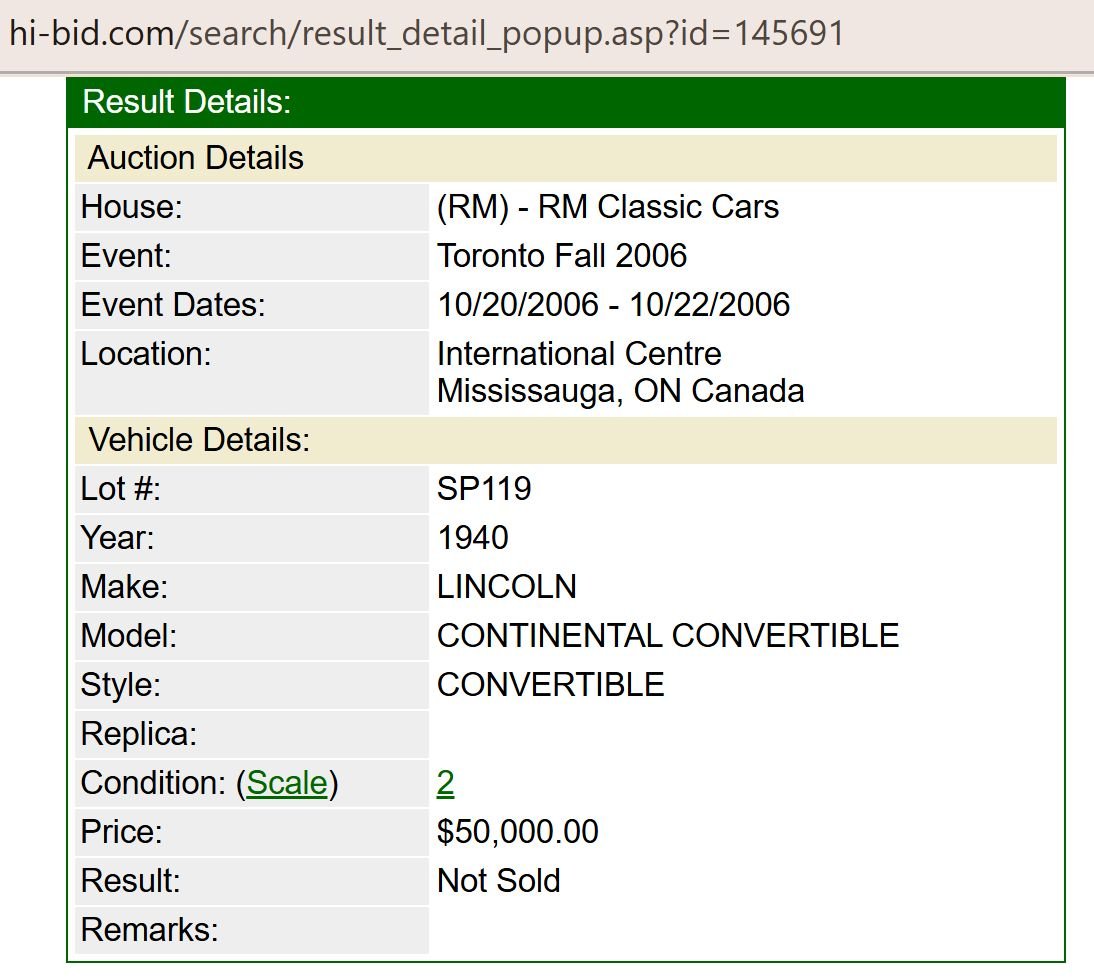Sale result from RM Auctions auction in October 2006 at Missassagua ON Canada: