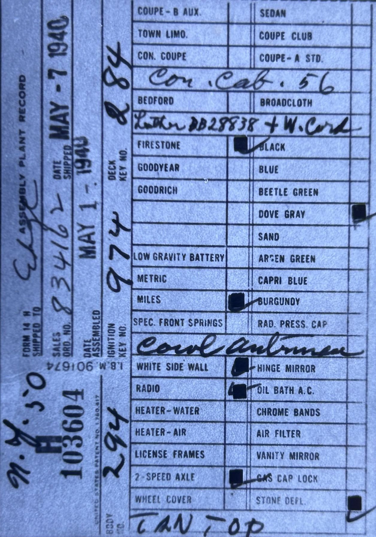Note: VIN number H69062 is stamped on the frame in the engine compartment. However, the VIN associated with this Body # in the Cole 1969 list, all records in the LCOC Directories, and the Assembly Plant Record is H103604.