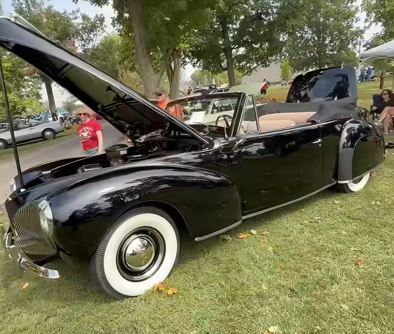 Black exterior, tan leather interior and dark tan leather on rear seat arm rests and tops of door panels, black with red piping top boot cover.