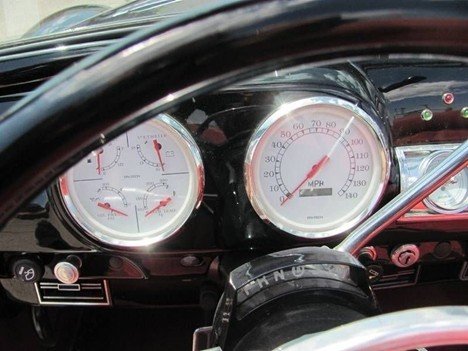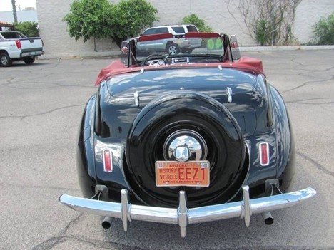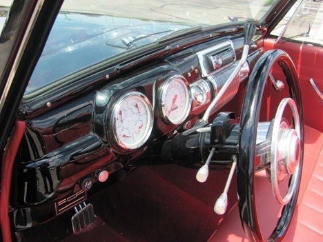 Note: radio antenna is on the driver’s side fender, no sideview mirrors, red boot cover, no front license plate holder, 1941? rear license plate light. Automatic transmission, modern gauges.