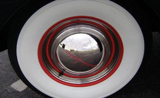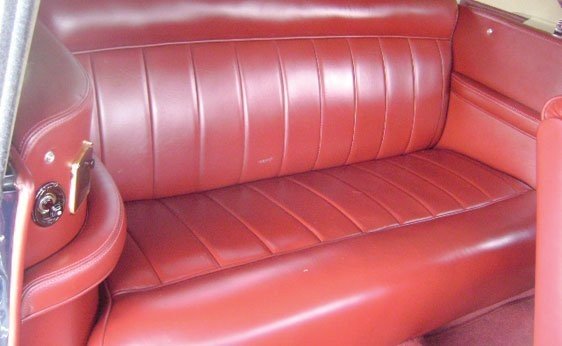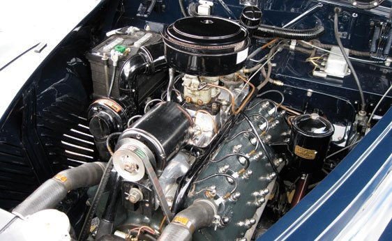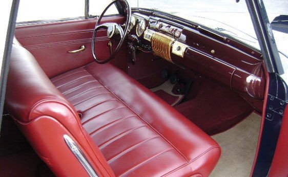 Note badge on driver’s-side engine cowl, cylinder heads are cast iron painted green, Washington Blue body, tan top, red leather interior.